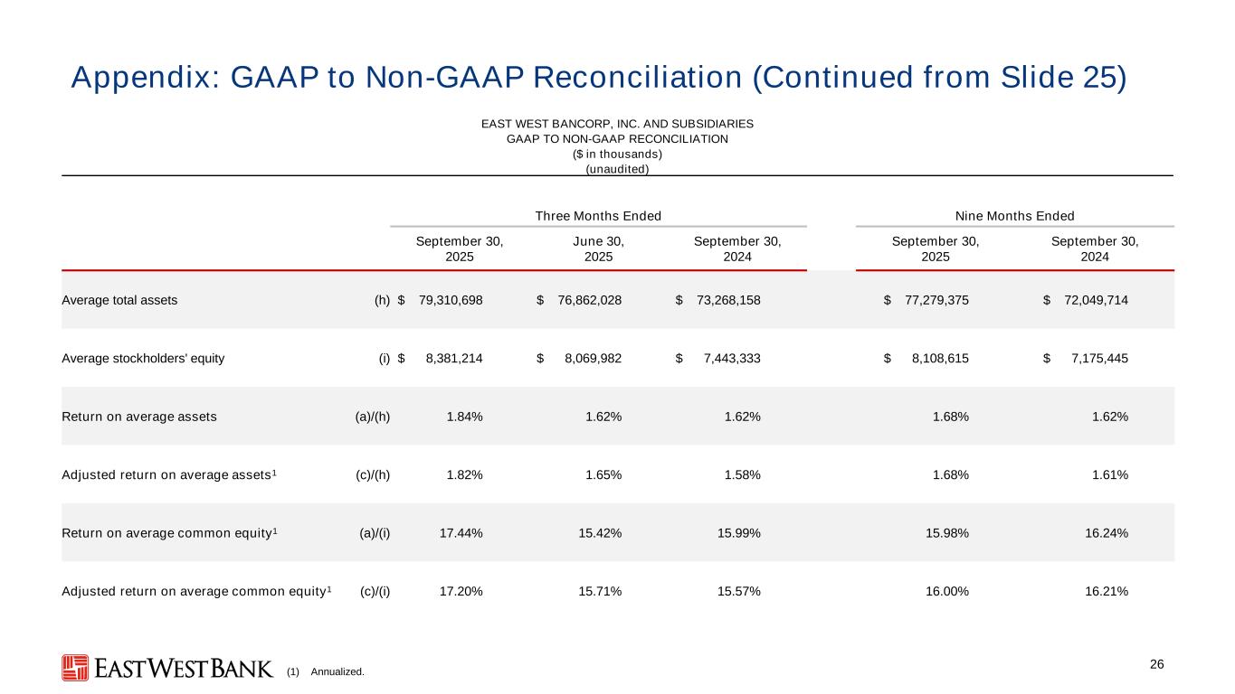 Appendix: GAAP to Non-GAAP Reconciliation 25 EAST WEST BANCORP, INC. AND SUBSIDIARIES GAAP TO NON-GAAP RECONCILIATION ($ in thousands) (unaudited) Adjusted net income and adjusted diluted EPS represent net income and diluted EPS adjusted for the following tax-effected impacts: discount accretion and interest recoveries from the full payment on purchased credit impaired and workout loans, change in equity award expense recognition for retirement eligible employees, FDIC special assessment and DC Solar adjustments; and the impact of the CA SSF. Management believes that presenting the computations of the adjusted net income, adjusted diluted EPS, adjusted return on average assets and adjusted return on average common equity that exclude the aforementioned tax- effected adjustments and the impact of the CA SSF provide clarity to financial statement users regarding the ongoing performance of the Company and allow comparability to prior periods. • Discount accretion and interest recoveries from the full payment on purchased credit impaired and workout loans are included in Interest and dividend income on the Condensed Consolidated Statement of Income. • During the third quarter and first nine months of 2025, the Company recorded $27 million of additional compensation due to the change in equity award expense recognition for retirement eligible employees lll(included in Compensation and employee benefits on the Condensed Consolidated Statement of Income). • FDIC special assessment reversals/charges are included in Deposit insurance premiums and regulatory assessments on the Condensed Consolidated Statement of Income. • DC Solar recoveries related to the Company’s investment in DC Solar are included in Amortization of Tax Credit and CRA Investments on the Condensed Consolidated Statement of Income. (1) Applied statutory tax rate of 28.18% for the three and nine months ended September 30, 2025, and the three months ended June 30, 2025. Applied statutory tax rate of 29.56% for the three and nine months ended September 30, 2024. Three Months Ended Nine Months Ended September 30, 2025 June 30, 2025 September 30, 2024 September 30, 2025 September 30, 2024 Net income (a) $ 368,394 $ 310,253 $ 299,166 $ 968,917 $ 872,471 Less: Loan payoff discount accretion and interest recoveries (b) (32,296) - - (32,296) - Add: Change in equity award expense recognition for retirement eligible employees (b) 27,141 - - 27,141 - Less/Add: FDIC special assessment (reversal) charge (b) (1,927) (833) - (1,927) 12,185 Less: DC Solar recovery (b) - - (11,201) - (14,347) Tax effects adjustments1 (b) 1,996 235 3,311 1,996 639 Add: Impact of the CA SSF (b) - 6,391 - 6,391 - Adjusted net income (c)=(a)+∑(b) $ 363,308 $ 316,046 $ 291,276 $ 970,222 $ 870,948 Diluted weighted-average number of shares outstanding (d) 138,942 138,789 139,648 139,090 139,939 Diluted EPS (e) $ 2.65 $ 2.24 $ 2.14 $ 6.97 $ 6.23 Less: Loan payoff discount accretion and interest recoveries (f) (0.23) - - (0.23) - Add: Change in equity award expense recognition for retirement eligible employees (f) 0.20 - - 0.20 - Less/Add: FDIC special assessment (reversal) charge (f) (0.01) (0.01) - (0.01) 0.09 Less: DC Solar recovery (f) - - (0.08) - (0.10) Tax effects of adjustments1 (f) 0.01 - 0.03 0.01 - Add: impact of the CA SSF (f) - 0.05 - 0.05 - Adjusted diluted EPS (g)=(e)+∑(f) $ 2.62 $ 2.28 $ 2.09 $ 6.99 $ 6.22