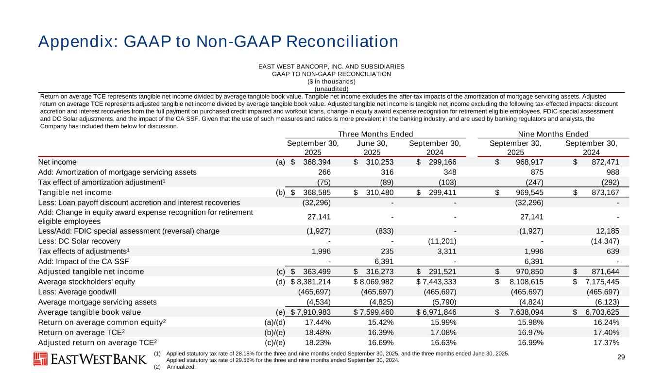 Appendix: GAAP to Non-GAAP Reconciliation 29 EAST WEST BANCORP, INC. AND SUBSIDIARIES GAAP TO NON-GAAP RECONCILIATION ($ in thousands) (unaudited) Return on average TCE represents tangible net income divided by average tangible book value. Tangible net income excludes the after-tax impacts of the amortization of mortgage servicing assets. Adjusted return on average TCE represents adjusted tangible net income divided by average tangible book value. Adjusted tangible net income is tangible net income excluding the following tax-effected impacts: discount accretion and interest recoveries from the full payment on purchased credit impaired and workout loans, change in equity award expense recognition for retirement eligible employees, FDIC special assessment and DC Solar adjustments, and the impact of the CA SSF. Given that the use of such measures and ratios is more prevalent in the banking industry, and are used by banking regulators and analysts, the Company has included them below for discussion. Three Months Ended Nine Months Ended September 30, 2025 June 30, 2025 September 30, 2024 September 30, 2025 September 30, 2024 Net income (a) $ 368,394 $ 310,253 $ 299,166 $ 968,917 $ 872,471 Add: Amortization of mortgage servicing assets 266 316 348 875 988 Tax effect of amortization adjustment1 (75) (89) (103) (247) (292) Tangible net income (b) $ 368,585 $ 310,480 $ 299,411 $ 969,545 $ 873,167 Less: Loan payoff discount accretion and interest recoveries (32,296) - - (32,296) - Add: Change in equity award expense recognition for retirement eligible employees 27,141 - - 27,141 - Less/Add: FDIC special assessment (reversal) charge (1,927) (833) - (1,927) 12,185 Less: DC Solar recovery - - (11,201) - (14,347) Tax effects of adjustments1 1,996 235 3,311 1,996 639 Add: Impact of the CA SSF - 6,391 - 6,391 - Adjusted tangible net income (c) $ 363,499 $ 316,273 $ 291,521 $ 970,850 $ 871,644 Average stockholders' equity (d) $ 8,381,214 $ 8,069,982 $ 7,443,333 $ 8,108,615 $ 7,175,445 Less: Average goodwill (465,697) (465,697) (465,697) (465,697) (465,697) Average mortgage servicing assets (4,534) (4,825) (5,790) (4,824) (6,123) Average tangible book value (e) $ 7,910,983 $ 7,599,460 $ 6,971,846 $ 7,638,094 $ 6,703,625 Return on average common equity2 (a)/(d) 17.44% 15.42% 15.99% 15.98% 16.24% Return on average TCE2 (b)/(e) 18.48% 16.39% 17.08% 16.97% 17.40% Adjusted return on average TCE2 (c)/(e) 18.23% 16.69% 16.63% 16.99% 17.37% (1) Applied statutory tax rate of 28.18% for the three and nine months ended September 30, 2025, and the three months ended June 30, 2025. Applied statutory tax rate of 29.56% for the three and nine months ended September 30, 2024. (2) Annualized.