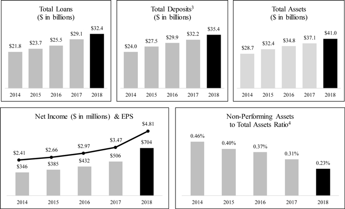 | · | Record Deposits: Total deposits grew $3.2 billion, or 9.9%, to a record $35.4 billion as of December 31, 2018, from $32.2 billion (including deposits held-for-sale) as of December 31, 2017, and at an annualized rate of 16% over the past ten years. |