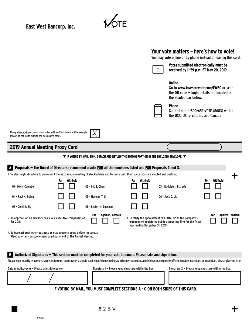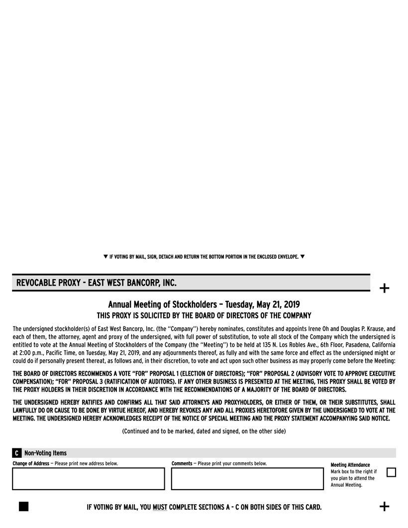 The Annual Meeting of Stockholders of East West Bancorp, Inc., a Delaware corporation (the “Company”), will be held on May 21, 2019, at 2:00 p.m. Pacific Time, at 135 N. Los Robles Ave., 6th Floor, Pasadena, California, for the following purposes, as more fully described in the accompanying Proxy Statement: