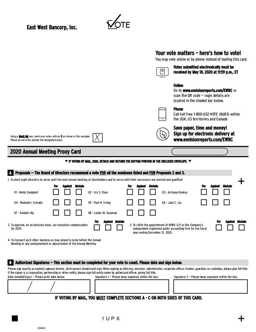 01 - Molly Campbell 04 - Rudolph I. Estrada 07 - Dominic Ng 02 - Iris S. Chan 05 - Paul H. Irving 08 - Lester M. Sussman 03 - Archana Deskus 06 - Jack C. Liu For Against Abstain For Against Abstain For Against Abstain 1 U P X East West Bancorp, Inc. Using a black ink pen, mark your votes with an X as shown in this example. Please do not write outside the designated areas. 038UUC + + Proposals — The Board of Directors recommend a vote FOR A all the nominees listed and FOR Proposals 2 and 3. 2. To approve, on an advisory basis, our executive compensation for 2019. 3. To ratify the appointment of KPMG LLP as the Company’s independent registered public accounting firm for the fiscal year ending December 31, 2020. 1. To elect eight directors to serve until the next annual meeting of stockholders and to serve until their successors are elected and qualified: For Against Abstain Please sign exactly as name(s) appears hereon. Joint owners should each sign. When signing as attorney, executor, administrator, corporate officer, trustee, guardian, or custodian, please give full title. If the signer is a corporation, partnership or other entity, please sign full entity name by authorized officer, giving full title. Date (mm/dd/yyyy) — Please print date below. Signature 1 — Please keep signature within the box. Signature 2 — Please keep signature within the box. B Authorized Signatures — This section must be completed for your vote to count. Please date and sign below. 4. To transact such other business as may properly come before the Annual Meeting or any postponement or adjournment of the Annual Meeting. qIF VOTING BY MAIL, SIGN, DETACH AND RETURN THE BOTTOM PORTION IN THE ENCLOSED ENVELOPE.q 2020 Annual Meeting Proxy Card For Against Abstain You may vote online or by phone instead of mailing this card. Online Go to www.envisionreports.com/EWBC or scan the QR code — login details are located in the shaded bar below. Phone Call toll free 1-800-652-VOTE (8683) within the USA, US territories and Canada Votes submitted electronically must be received by May 18, 2020 at 11:59 p.m., ET Your vote matters – here’s how to vote! Save paper, time and money! Sign up for electronic delivery at www.envisionreports.com/EWBC IF VOTING BY MAIL, YOU MUST COMPLETE SECTIONS A - C ON BOTH SIDES OF THIS CARD.