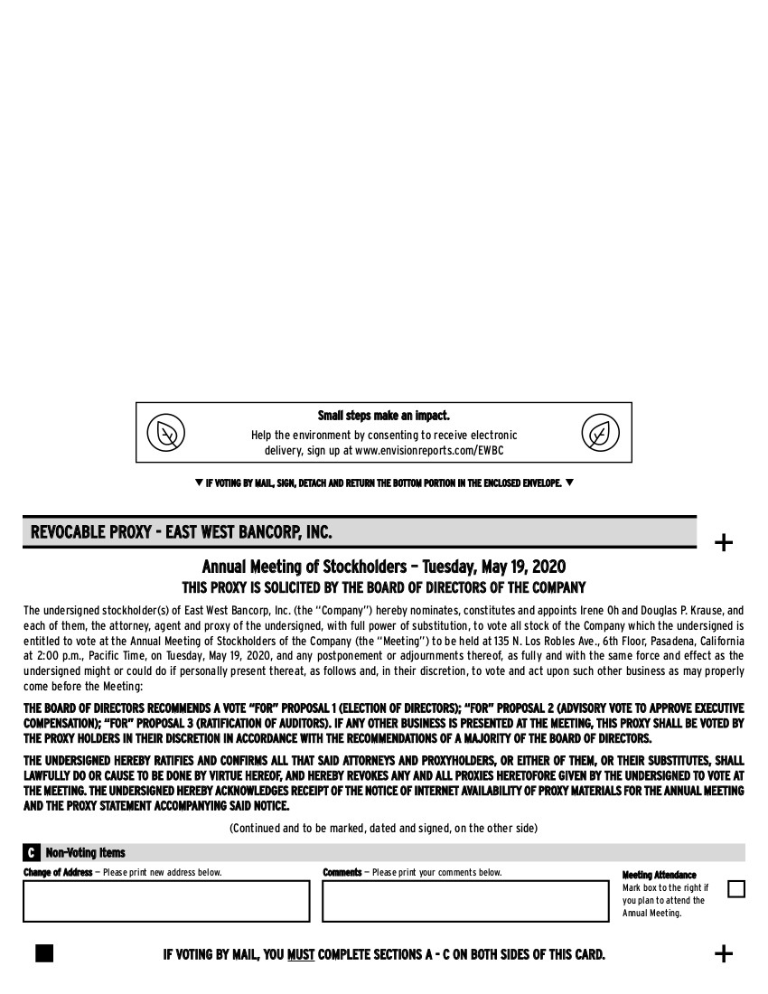 Annual Meeting of Stockholders – Tuesday, May 19, 2020 THIS PROXY IS SOLICITED BY THE BOARD OF DIRECTORS OF THE COMPANY The undersigned stockholder(s) of East West Bancorp, Inc. (the “Company”) hereby nominates, constitutes and appoints Irene Oh and Douglas P. Krause, and each of them, the attorney, agent and proxy of the undersigned, with full power of substitution, to vote all stock of the Company which the undersigned is entitled to vote at the Annual Meeting of Stockholders of the Company (the “Meeting”) to be held at 135 N. Los Robles Ave., 6th Floor, Pasadena, California at 2:00 p.m., Pacific Time, on Tuesday, May 19, 2020, and any postponement or adjournments thereof, as fully and with the same force and effect as the undersigned might or could do if personally present thereat, as follows and, in their discretion, to vote and act upon such other business as may properly come before the Meeting: THE BOARD OF DIRECTORS RECOMMENDS A VOTE “FOR” PROPOSAL 1 (ELECTION OF DIRECTORS); “FOR” PROPOSAL 2 (ADVISORY VOTE TO APPROVE EXECUTIVE COMPENSATION); “FOR” PROPOSAL 3 (RATIFICATION OF AUDITORS). IF ANY OTHER BUSINESS IS PRESENTED AT THE MEETING, THIS PROXY SHALL BE VOTED BY THE PROXY HOLDERS IN THEIR DISCRETION IN ACCORDANCE WITH THE RECOMMENDATIONS OF A MAJORITY OF THE BOARD OF DIRECTORS. THE UNDERSIGNED HEREBY RATIFIES AND CONFIRMS ALL THAT SAID ATTORNEYS AND PROXYHOLDERS, OR EITHER OF THEM, OR THEIR SUBSTITUTES, SHALL LAWFULLY DO OR CAUSE TO BE DONE BY VIRTUE HEREOF, AND HEREBY REVOKES ANY AND ALL PROXIES HERETOFORE GIVEN BY THE UNDERSIGNED TO VOTE AT THE MEETING. THE UNDERSIGNED HEREBY ACKNOWLEDGES RECEIPT OF THE NOTICE OF INTERNET AVAILABILITY OF PROXY MATERIALS FOR THE ANNUAL MEETING AND THE PROXY STATEMENT ACCOMPANYING SAID NOTICE. (Continued and to be marked, dated and signed, on the other side) REVOCABLE PROXY - EAST WEST BANCORP, INC. qIF VOTING BY MAIL, SIGN, DETACH AND RETURN THE BOTTOM PORTION IN THE ENCLOSED ENVELOPE.q C Non-Voting Items + + Change of Address — Please print new address below. Comments — Please print your comments below. Meeting Attendance Mark box to the right if you plan to attend the Annual Meeting. Small steps make an impact. Help the environment by consenting to receive electronic delivery, sign up at www.envisionreports.com/EWBC IF VOTING BY MAIL, YOU MUST COMPLETE SECTIONS A - C ON BOTH SIDES OF THIS CARD.
