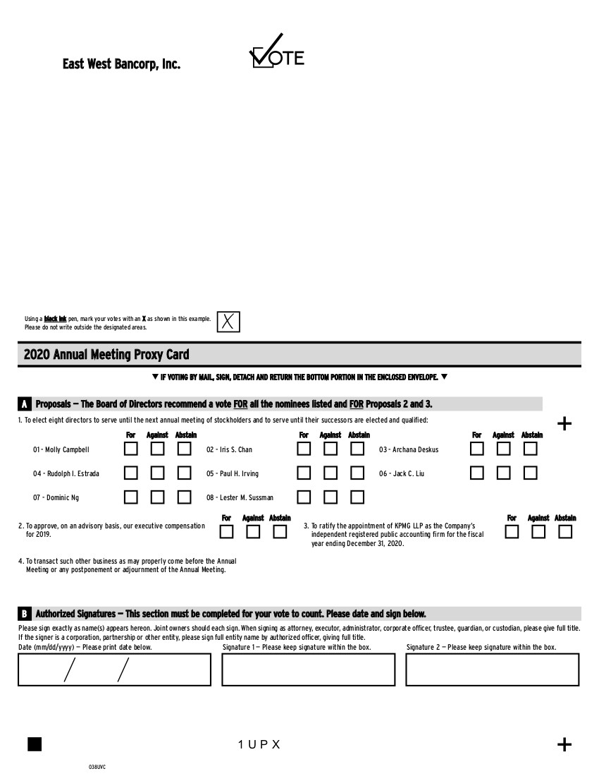 01 - Molly Campbell 04 - Rudolph I. Estrada 07 - Dominic Ng 02 - Iris S. Chan 05 - Paul H. Irving 08 - Lester M. Sussman 03 - Archana Deskus 06 - Jack C. Liu For Against Abstain For Against Abstain For Against Abstain 1 U P X East West Bancorp, Inc. Using a black ink pen, mark your votes with an X as shown in this example. Please do not write outside the designated areas. 038UVC + + Proposals — The Board of Directors recommend a vote FOR A all the nominees listed and FOR Proposals 2 and 3. 2. To approve, on an advisory basis, our executive compensation for 2019. 3. To ratify the appointment of KPMG LLP as the Company’s independent registered public accounting firm for the fiscal year ending December 31, 2020. 1. To elect eight directors to serve until the next annual meeting of stockholders and to serve until their successors are elected and qualified: For Against Abstain Please sign exactly as name(s) appears hereon. Joint owners should each sign. When signing as attorney, executor, administrator, corporate officer, trustee, guardian, or custodian, please give full title. If the signer is a corporation, partnership or other entity, please sign full entity name by authorized officer, giving full title. Date (mm/dd/yyyy) — Please print date below. Signature 1 — Please keep signature within the box. Signature 2 — Please keep signature within the box. B Authorized Signatures — This section must be completed for your vote to count. Please date and sign below. 4. To transact such other business as may properly come before the Annual Meeting or any postponement or adjournment of the Annual Meeting. qIF VOTING BY MAIL, SIGN, DETACH AND RETURN THE BOTTOM PORTION IN THE ENCLOSED ENVELOPE.q 2020 Annual Meeting Proxy Card For Against Abstain