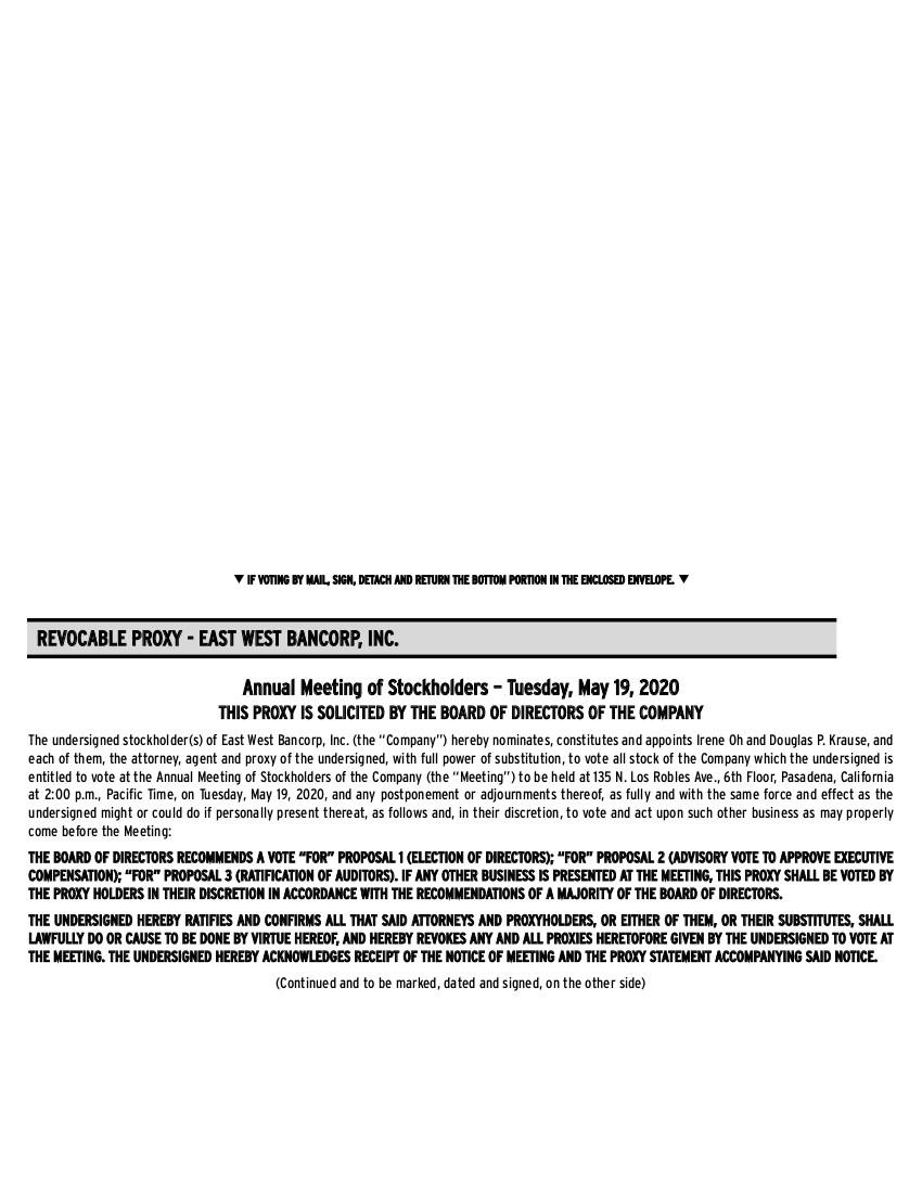 Annual Meeting of Stockholders – Tuesday, May 19, 2020 THIS PROXY IS SOLICITED BY THE BOARD OF DIRECTORS OF THE COMPANY The undersigned stockholder(s) of East West Bancorp, Inc. (the “Company”) hereby nominates, constitutes and appoints Irene Oh and Douglas P. Krause, and each of them, the attorney, agent and proxy of the undersigned, with full power of substitution, to vote all stock of the Company which the undersigned is entitled to vote at the Annual Meeting of Stockholders of the Company (the “Meeting”) to be held at 135 N. Los Robles Ave., 6th Floor, Pasadena, California at 2:00 p.m., Pacific Time, on Tuesday, May 19, 2020, and any postponement or adjournments thereof, as fully and with the same force and effect as the undersigned might or could do if personally present thereat, as follows and, in their discretion, to vote and act upon such other business as may properly come before the Meeting: THE BOARD OF DIRECTORS RECOMMENDS A VOTE “FOR” PROPOSAL 1 (ELECTION OF DIRECTORS); “FOR” PROPOSAL 2 (ADVISORY VOTE TO APPROVE EXECUTIVE COMPENSATION); “FOR” PROPOSAL 3 (RATIFICATION OF AUDITORS). IF ANY OTHER BUSINESS IS PRESENTED AT THE MEETING, THIS PROXY SHALL BE VOTED BY THE PROXY HOLDERS IN THEIR DISCRETION IN ACCORDANCE WITH THE RECOMMENDATIONS OF A MAJORITY OF THE BOARD OF DIRECTORS. THE UNDERSIGNED HEREBY RATIFIES AND CONFIRMS ALL THAT SAID ATTORNEYS AND PROXYHOLDERS, OR EITHER OF THEM, OR THEIR SUBSTITUTES, SHALL LAWFULLY DO OR CAUSE TO BE DONE BY VIRTUE HEREOF, AND HEREBY REVOKES ANY AND ALL PROXIES HERETOFORE GIVEN BY THE UNDERSIGNED TO VOTE AT THE MEETING. THE UNDERSIGNED HEREBY ACKNOWLEDGES RECEIPT OF THE NOTICE OF MEETING AND THE PROXY STATEMENT ACCOMPANYING SAID NOTICE. (Continued and to be marked, dated and signed, on the other side) REVOCABLE PROXY - EAST WEST BANCORP, INC. qIF VOTING BY MAIL, SIGN, DETACH AND RETURN THE BOTTOM PORTION IN THE ENCLOSED ENVELOPE.q