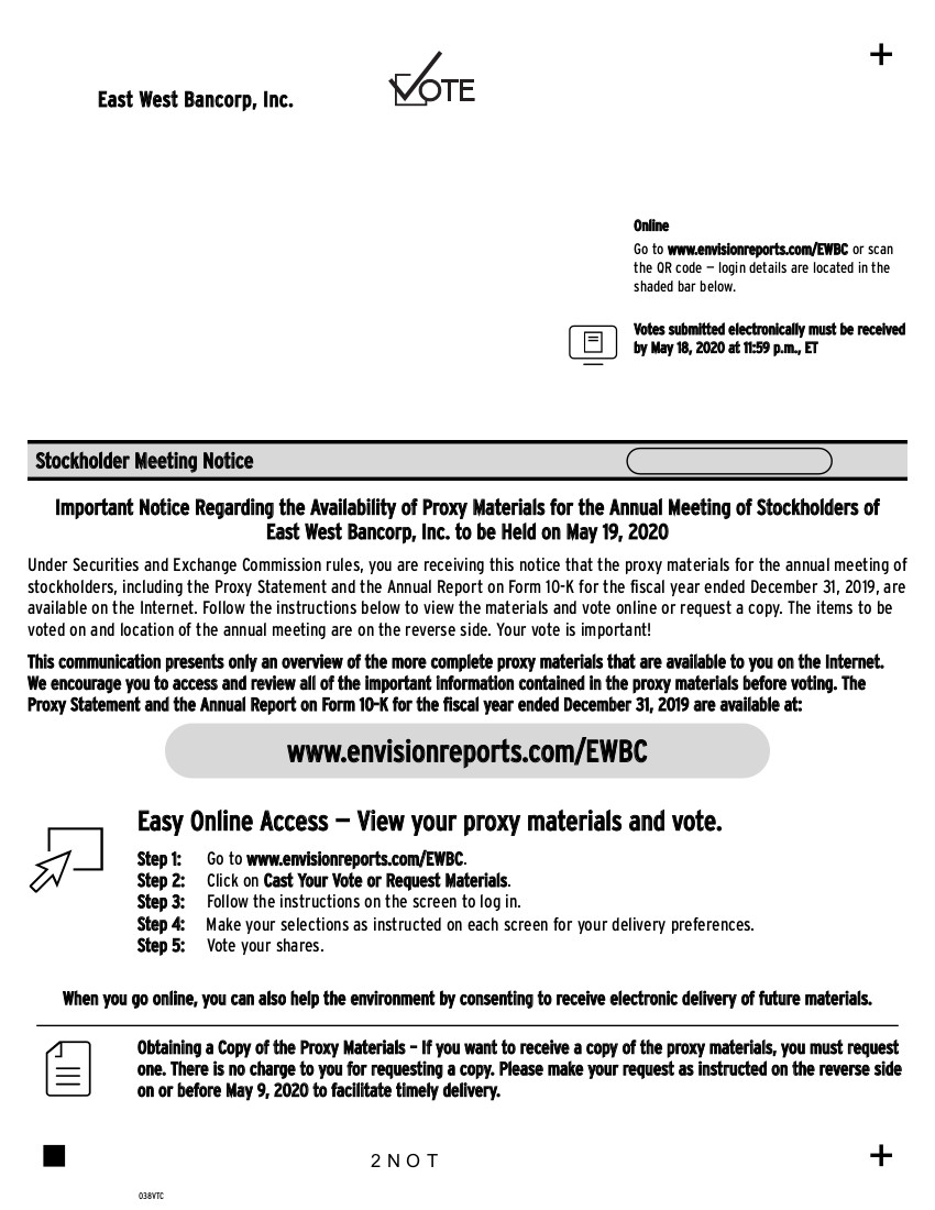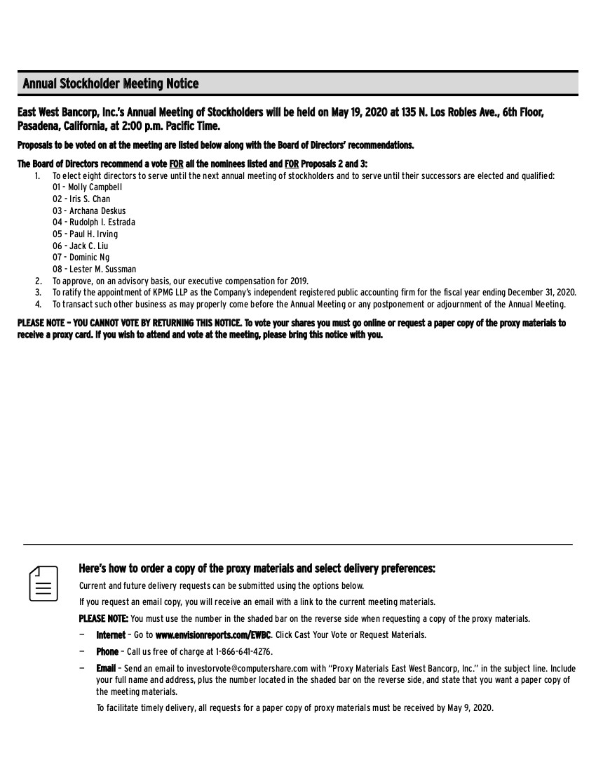 Here’s how to order a copy of the proxy materials and select delivery preferences: Current and future delivery requests can be submitted using the options below. If you request an email copy, you will receive an email with a link to the current meeting materials. PLEASE NOTE: You must use the number in the shaded bar on the reverse side when requesting a copy of the proxy materials. — Internet – Go to www.envisionreports.com/EWBC. Click Cast Your Vote or Request Materials. — Phone – Call us free of charge at 1-866-641-4276. — Email – Send an email to investorvote@computershare.com with “Proxy Materials East West Bancorp, Inc.” in the subject line. Include your full name and address, plus the number located in the shaded bar on the reverse side, and state that you want a paper copy of the meeting materials. To facilitate timely delivery, all requests for a paper copy of proxy materials must be received by May 9, 2020. East West Bancorp, Inc.’s Annual Meeting of Stockholders will be held on May 19, 2020 at 135 N. Los Robles Ave., 6th Floor, Pasadena, California, at 2:00 p.m. Pacific Time. Proposals to be voted on at the meeting are listed below along with the Board of Directors’ recommendations. The Board of Directors recommend a vote FOR all the nominees listed and FOR Proposals 2 and 3: 1. To elect eight directors to serve until the next annual meeting of stockholders and to serve until their successors are elected and qualified: 01 - Molly Campbell 02 - Iris S. Chan 03 - Archana Deskus 04 - Rudolph I. Estrada 05 - Paul H. Irving 06 - Jack C. Liu 07 - Dominic Ng 08 - Lester M. Sussman 2. To approve, on an advisory basis, our executive compensation for 2019. 3. To ratify the appointment of KPMG LLP as the Company’s independent registered public accounting firm for the fiscal year ending December 31, 2020. 4. To transact such other business as may properly come before the Annual Meeting or any postponement or adjournment of the Annual Meeting. PLEASE NOTE – YOU CANNOT VOTE BY RETURNING THIS NOTICE. To vote your shares you must go online or request a paper copy of the proxy materials to receive a proxy card. If you wish to attend and vote at the meeting, please bring this notice with you. Annual Stockholder Meeting Notice