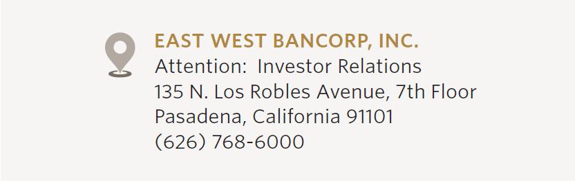 Our Annual Report and this Proxy Statement are posted on our website at www.eastwestbank.com and are available from the SEC at its website at www.sec.gov. You may also obtain a copy of our Annual Report and any exhibits thereto without charge by sending a written request to Investor Relations, East West Bancorp, Inc., 135 N. Los Robles Avenue, 7th Floor, Pasadena, California 91101. The Annual Report on Form 10-K will be mailed to all stockholders. The Annual Report on Form 10-K includes financial statements required to be filed with the SEC pursuant to the Exchange Act for the year ended December 31, 2022, and the report thereon of KPMG LLP, our independent registered public accounting firm.