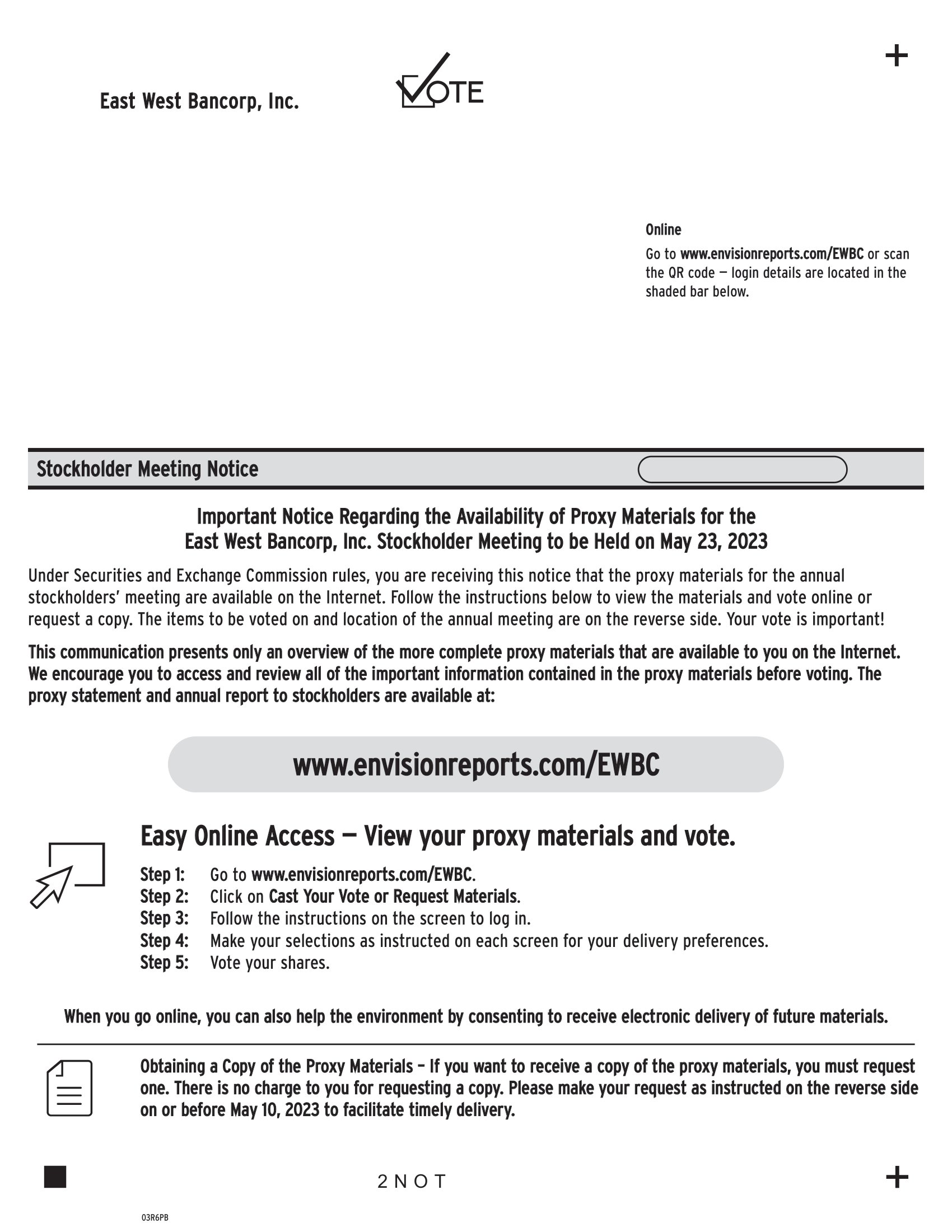 On or about April 10, 2023, we began mailing to our stockholders of record a Notice of Internet Availability of Proxy Materials containing instructions on how to access and review this Proxy Statement, our Annual Report on Form 10-K for the year ended December 31, 2022 (“Annual Report on Form 10-K”), how to vote, participate in the Annual Meeting, and request a printed copy of our proxy materials. Our Proxy Statement and Annual Report on Form 10-K are also available at: www.envisionreports.com/EWBC.