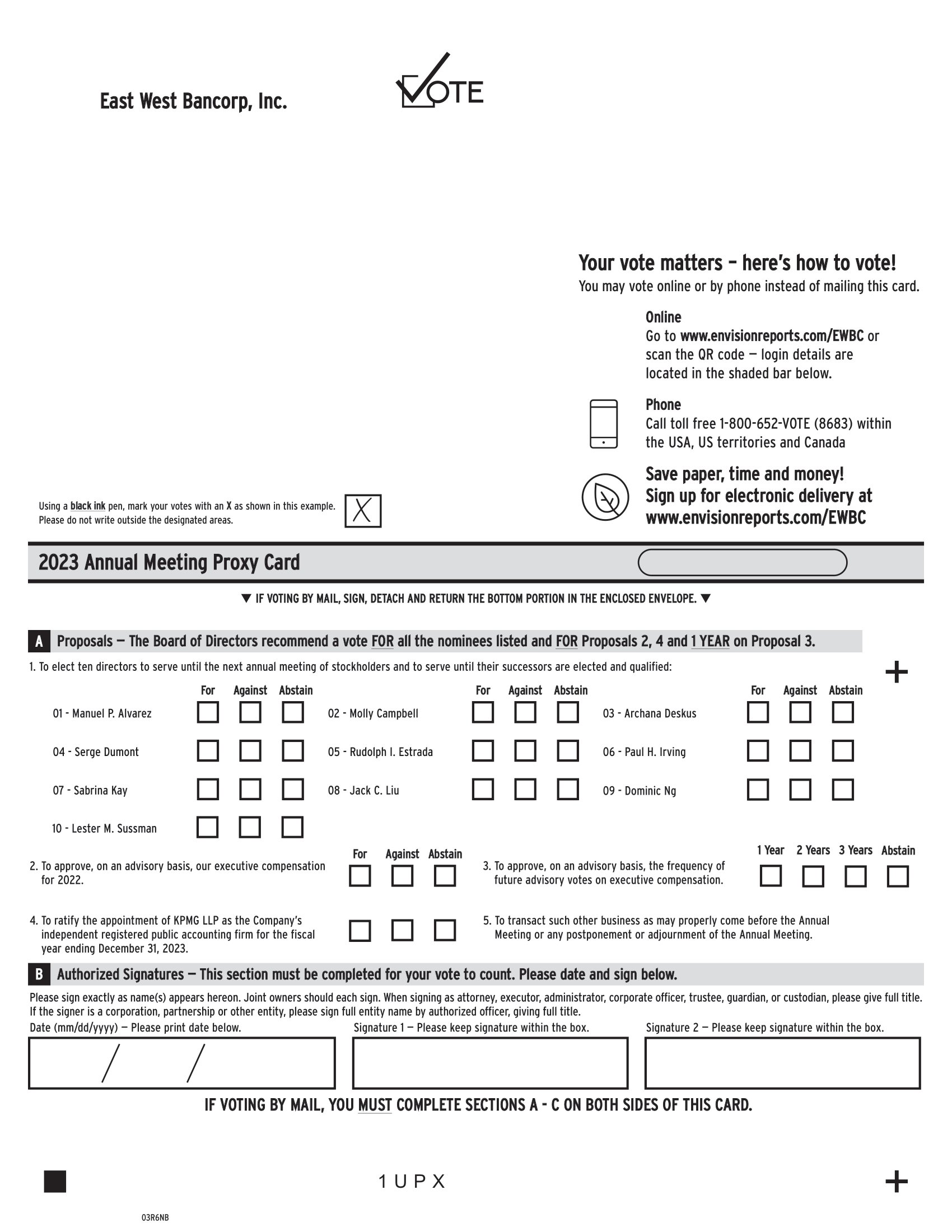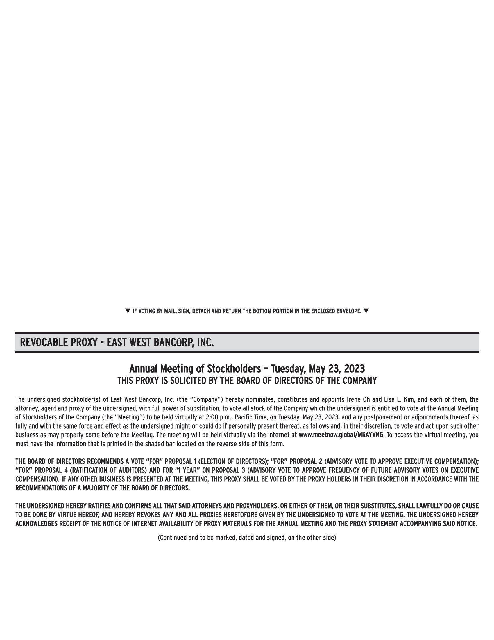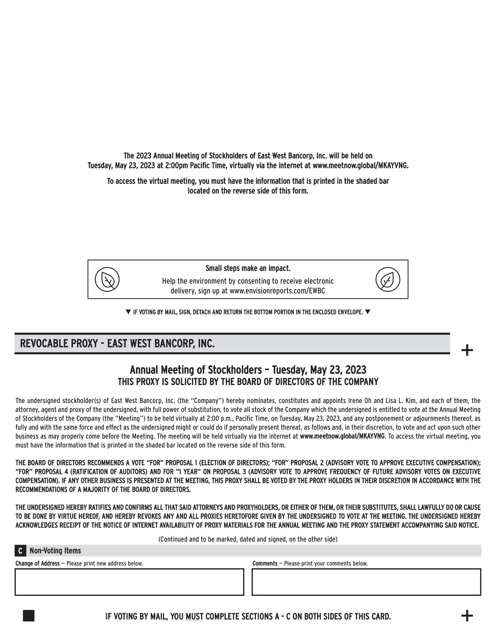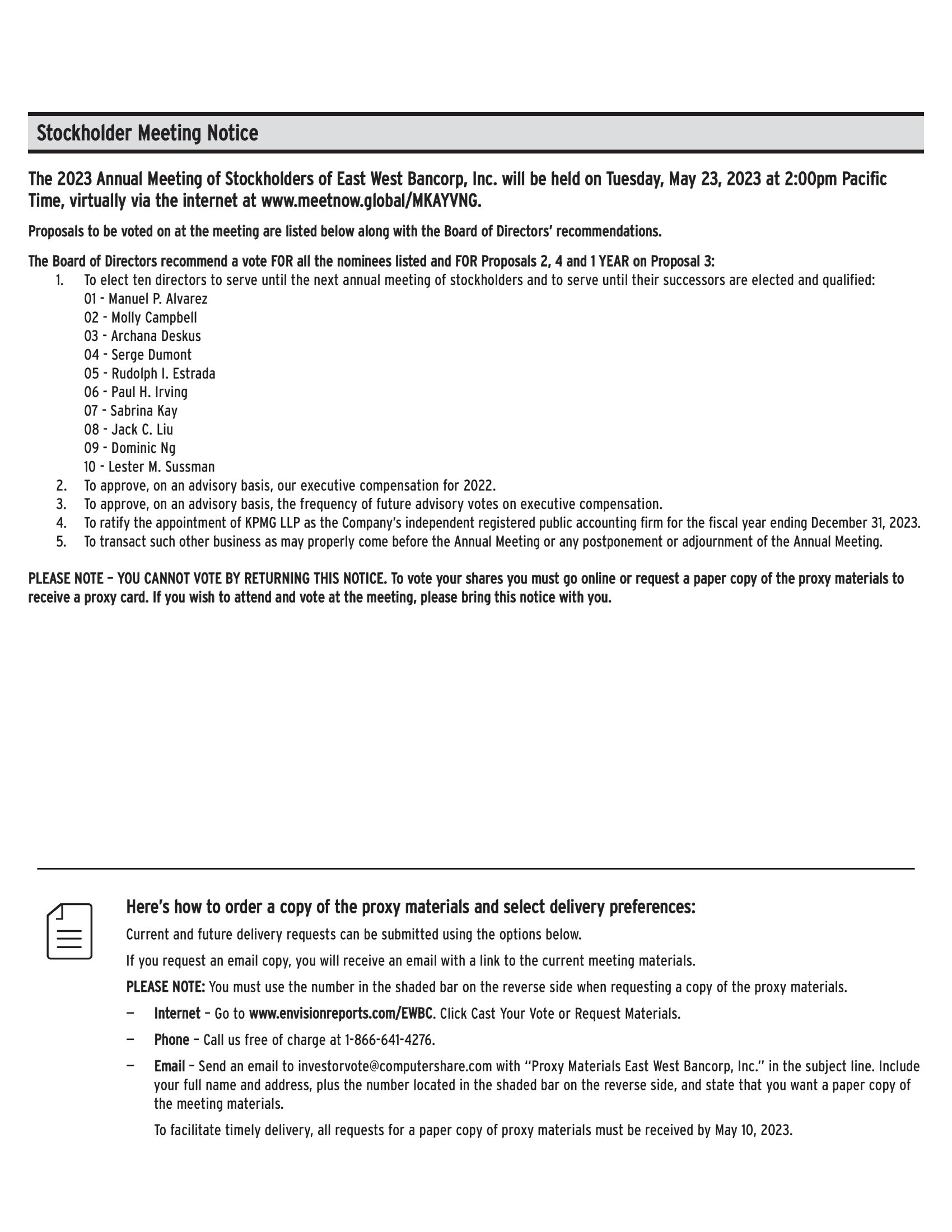 | › | Instruct the proxy holder or holders on how to vote your shares by using the internet voting site at www. envisionreports.com/EWBC or the toll-free telephone number 1-800-652-VOTE (8683), 24-hours a day, seven days a week, until 2:00 p.m. Pacific Time on May 23, 2023 (have your proxy card in hand when you visit the website or call); |