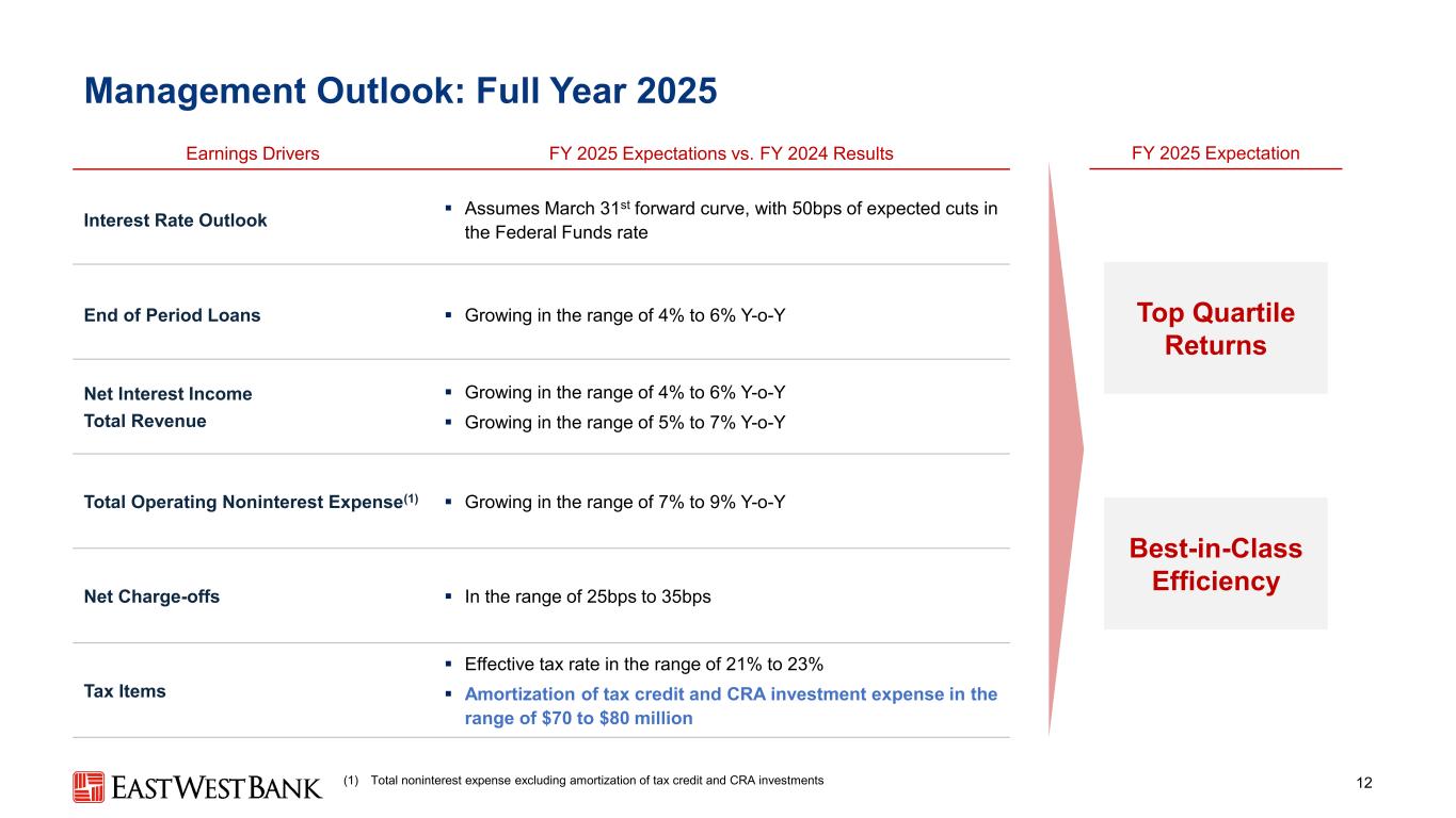 06.30.24 9.3% 9.4% 9.7% 9.6% 9.9% Tangible Common Equity Ratio 14.8% 15.1% 15.4% 15.6% 15.6% Total Capital Ratio 13.5% 13.7% 14.1% 14.3% 14.3% CET1 Ratio 10.1% 10.4% 10.4% 10.4% 10.5% Leverage Ratio Capital 11 Healthy capital position: $85 million of share repurchases in 1Q25 Highlights 03.31.24 12.31.2409.30.24 ▪ Opportunistic stock repurchase activity in Q1 ‒ Repurchased $85mm (~920K shares) in 1Q25 ‒ Grew both book and tangible book value1 3% Q-o-Q ▪ Capacity for ongoing repurchases ‒ $244 million of East West’s share repurchase authorization remains available; we remain opportunistic ▪ Declared 2Q25 dividend of $0.60 ‒ Payable on May 16, 2025 to shareholders of record on May 2, 2025 Regulatory well capitalized requirement Tangible Common Equity Ratio1 Regulatory Capital Ratios2 6.5% 5.0% 10.0% 03.31.253 (1) See reconciliation of GAAP to non-GAAP financial measures in the appendix and in the Company’s earnings press release (2) The Company has applied the 2020 Current Expected Credit Losses (CECL) transition provision in the December 31, 2024, September 30, 2024, June 30, 2024, and March 31, 2024 regulatory capital ratio calculations. The CECL transition provision permits certain banking organizations to exclude from regulatory capital the initial adoption impact of CECL, plus 25% of the cumulative changes in the allowance for credit losses under CECL for each period until December 31, 2021, followed by a three-year phase-out period in which the aggregate benefit is reduced by 25% in 2022, 50% in 2023, and 75% in 2024. The CECL transition effect is no longer in effect as of March 31, 2025 (3) The Company’s March 31, 2025 regulatory capital ratios and Risk-Weighted Assets (RWA) are preliminary