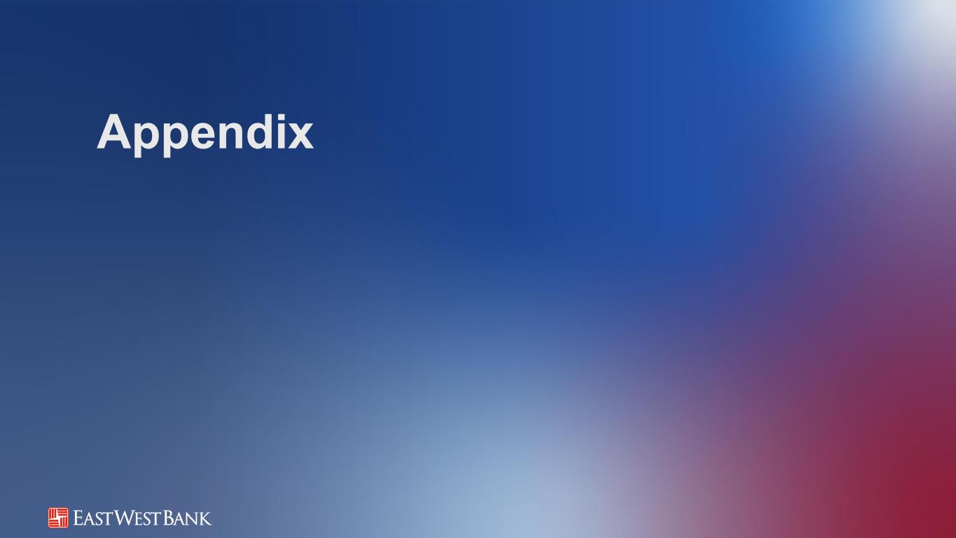 Appendix: GAAP to Non-GAAP Reconciliation 25 EAST WEST BANCORP, INC. AND SUBSIDIARIES GAAP TO NON-GAAP RECONCILIATION ($ in thousands) (unaudited) Adjusted net income represents net income adjusted for the tax-effected adjustments below. Adjusted diluted EPS represents diluted EPS adjusted for the tax-effected adjustments below. Management believes that the measures and ratios presented below provide clarity to financial statement users regarding the ongoing performance of the Company and allow comparability to prior periods. During the first quarters of 2025 and 2024, the Company recorded $833 thousand and $10 million, respectively, of pre-tax FDIC special assessment charges. The Company recorded a $3 million FDIC special assessment reversal during the fourth quarter of 2024. Pre-tax FDIC special assessment charges/reversals are included in Deposit insurance premiums and regulatory assessments on the Condensed Consolidated Statement of Income. During the fourth quarter of 2024, the Company recorded $343 thousand in pre-tax DC Solar recoveries (included in Amortization of Tax Credit and CRA Investments on the Condensed Consolidated Statement of Income) related to the Company’s investment in DC Solar. Three Months Ended March 31, 2025 December 31, 2024 March 31, 2024 Net income $ 290,270 $ 293,115 $ 285,075 Less/Add: FDIC special assessment charge (reversal) 833 (3,385) 10,305 Less: DC Solar recovery — (343) — Tax effect of adjustments (1) (248) 1,109 (3,046) Adjusted net income $ 290,855 $ 290,496 $ 292,334 Diluted weighted-average number of shares outstanding 139,291 139,883 140,261 Diluted EPS $ 2.08 $ 2.10 $ 2.03 Less/Add: FDIC special assessment charge (reversal) 0.01 (0.03) 0.07 Less: DC Solar recovery — — — Tax effect of adjustments (1) — 0.01 (0.02) Adjusted diluted EPS $ 2.09 $ 2.08 $ 2.08 (1) Applied statutory tax rate of 29.73% for the three months ended March 31, 2025 and December 31, 2024. Applied statutory tax rate of 29.56% for the three months ended March 31, 2024