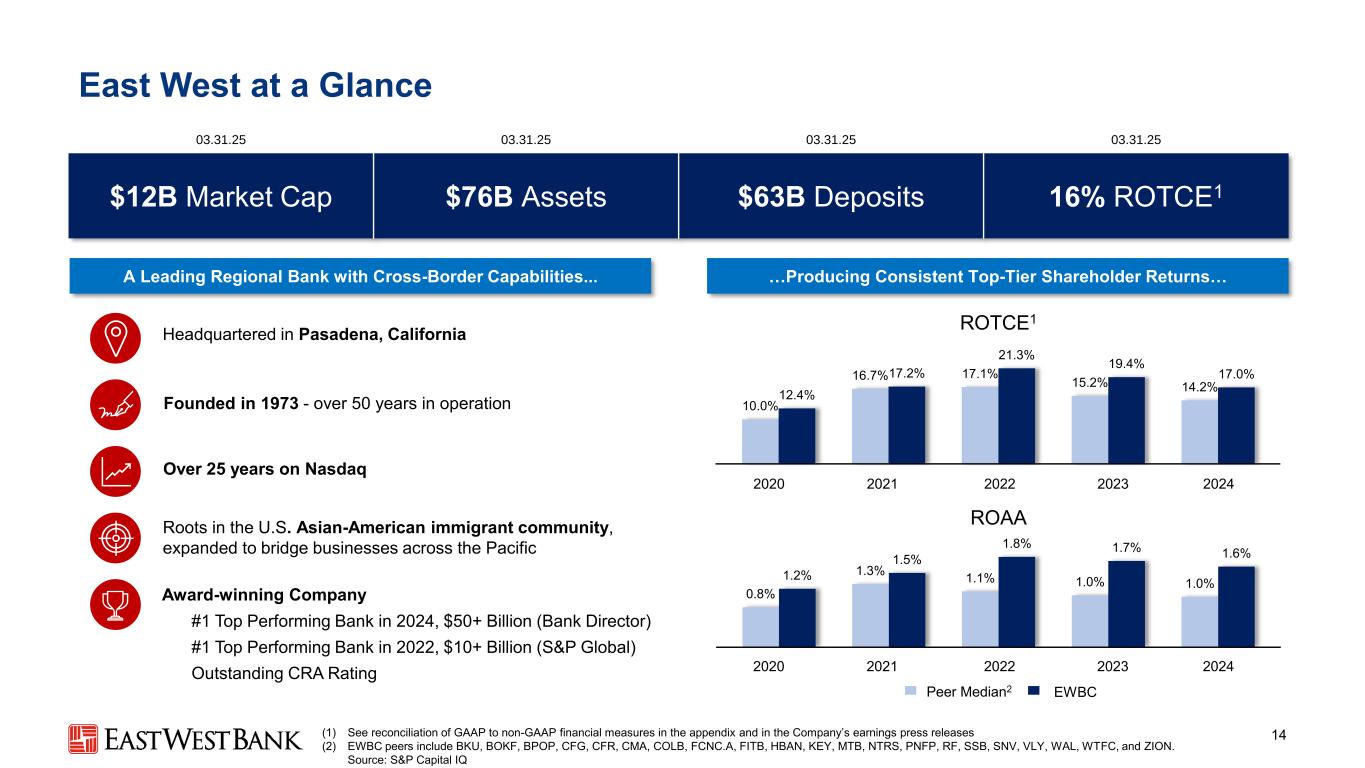 Forward-Looking Statements and Additional Information In this presentation, “we”, “our”, “us”, “East West” and the Company refer to East West Bancorp, Inc., and our consolidated subsidiaries unless the context indicates otherwise. Forward-Looking Statements This presentation contains forward-looking statements that are intended to be covered by the safe harbor for such statements provided by the Private Securities Litigation Reform Act of 1995. These statements are based on the current assumptions, beliefs, estimates, and projections, many of which, by their nature, are inherently uncertain and beyond our control. You should not place undue reliance on these statements. There are various important factors that could cause the Company’s future results to differ materially from historical performance and any forward-looking statements, including the factors described in the Company’s filings with the Securities and Exchange Commission, including the “Risk Factors” section of the Company’s Annual Report on Form 10-K for the year ended December 31, 2024. When considering these forward- looking statements, you should keep in mind these risks and uncertainties, as well as any cautionary statements the Company may make. These statements speak only as of the date they are made and are based only on information then actually known to the Company. The Company does not undertake, and specifically disclaims, any obligation to update or revise any forward-looking statements, whether written or oral, except as required by law. Basis of Presentation The preparation of the Company’s consolidated financial statements in conformity with U.S. generally accepted accounting principles (“GAAP”) requires management to make estimates and assumptions that affect the reported amounts of assets and liabilities as of the date of the consolidated financial statements, income and expenses during the reporting periods, and the related disclosures. Although our estimates consider current conditions and how we expect them to change in the future, it is reasonably possible that actual results could be materially different from those estimates. Hence, the current period’s results of operations are not necessarily indicative of results that may be expected for any future interim period or for the year as a whole. Certain prior period information have been reclassified to conform to the current presentation. Industry Information This presentation includes statistical and other industry and market data that we obtained from government reports and other third-party sources. Although we believe that this information is accurate and reliable, we have not independently verified such information. Forward-looking information that we have obtained from these sources is subject to the same uncertainties and qualifications as other forward-looking statements contained herein. Non-GAAP Financial Measures Certain financial information in this presentation has not been prepared in accordance with GAAP and is presented on a non-GAAP basis. Investors should refer to the reconciliations included in the appendix to this presentation and should consider the Company’s non-GAAP measures in addition to, not as a substitute for or superior to, measures prepared in accordance with GAAP. These measures may not be comparable to similarly titled measures used by other companies. 2