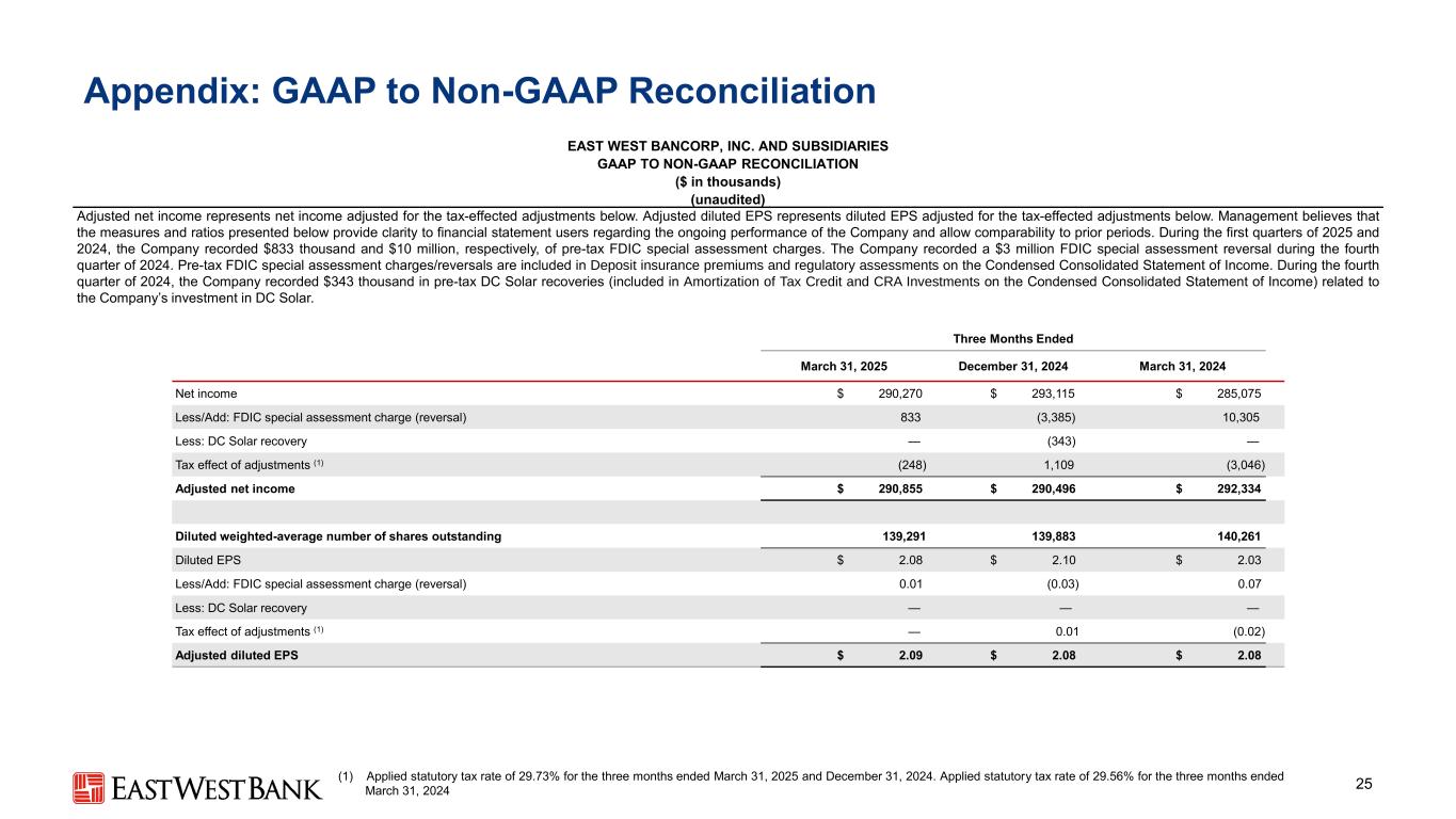 Appendix: GAAP to Non-GAAP Reconciliation 24 Three Months Ended March 31, 2025 December 31, 2024 March 31, 2024 Net interest income before provision for credit losses (a) $ 600,201 $ 587,626 $ 565,139 FTE adjustment (b) 1,146 1,276 1,576 FTE net interest income before provision for credit losses (c)=(a)+(b) 601,347 588,902 566,715 Total noninterest income (d) 92,102 88,166 78,487 Total revenue (e)=(a)+(d) 692,303 675,792 643,626 Total revenue (FTE) (f)=(c)+(d) $ 693,449 $ 677,068 $ 645,202 Total noninterest expense (g) $ 252,148 $ 249,968 $ 246,374 Efficiency ratio (g)/(e) 36.42 % 36.99 % 38.28 % Efficiency ratio (FTE) (g)/(f) 36.36 % 36.92 % 38.19 % Pre-tax, pre-provision income (f)-(g) $ 441,301 $ 427,100 $ 398,828 EAST WEST BANCORP, INC. AND SUBSIDIARIES GAAP TO NON-GAAP RECONCILIATION ($ in thousands) (unaudited) The Company uses certain non-GAAP financial measures to provide supplemental information regarding the Company’s performance. Non-GAAP measures used consist of fully taxable equivalent (“FTE”) net interest income and total revenue. The FTE adjustment relates to tax exempt interest on certain investment securities and loans. Efficiency ratio represents noninterest expenses divided by total revenue (FTE). Pre-tax, pre- provision income represents total revenue (FTE) less noninterest expense.