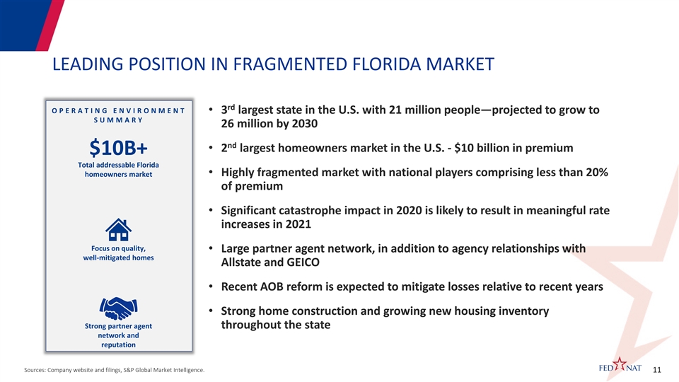 MULTIPLE LONG-TERM VALUE DRIVERS ü Strong brand and agent distribution with underwriting discipline TAKEN ACTION TO IMPROVE PROFITABILITY IN ü Multiple rounds of approved rate increases with additional rate increases pending FLORIDA ü Managing policy counts and total exposures until rate adequacy achieved ü Organic geographic diversification via partnership with MGU SageSure DIVERSIFYING RISK THROUGH EXPANSION OUTSIDE ü Additional geographic expansion with acquisition of Maison in Dec. 2019 OF FLORIDA ü Non-Florida markets have more favorable operating environment including less litigation and more flexibility in setting rates ü Significant fee and commission income without corresponding capital requirements FLEXIBLE CORPORATE STRUCTURE GENERATING ü Premium growth and CAT claims generate incremental fee income SIGNIFICANT FEE INCOME ü Meaningful free cash flow outside of statutory entities ü Maintaining appropriate levels of statutory capital in insurance companies and liquidity at holding company BALANCE SHEET SUPPORTS LONG-TERM VALUE ü Efficient and effective use of reinsurance programs CREATION ü Long-standing relationships with highly-rated reinsurers 10 10MULTIPLE LONG-TERM VALUE DRIVERS ü Strong brand and agent distribution with underwriting discipline TAKEN ACTION TO IMPROVE PROFITABILITY IN ü Multiple rounds of approved rate increases with additional rate increases pending FLORIDA ü Managing policy counts and total exposures until rate adequacy achieved ü Organic geographic diversification via partnership with MGU SageSure DIVERSIFYING RISK THROUGH EXPANSION OUTSIDE ü Additional geographic expansion with acquisition of Maison in Dec. 2019 OF FLORIDA ü Non-Florida markets have more favorable operating environment including less litigation and more flexibility in setting rates ü Significant fee and commission income without corresponding capital requirements FLEXIBLE CORPORATE STRUCTURE GENERATING ü Premium growth and CAT claims generate incremental fee income SIGNIFICANT FEE INCOME ü Meaningful free cash flow outside of statutory entities ü Maintaining appropriate levels of statutory capital in insurance companies and liquidity at holding company BALANCE SHEET SUPPORTS LONG-TERM VALUE ü Efficient and effective use of reinsurance programs CREATION ü Long-standing relationships with highly-rated reinsurers 10 10