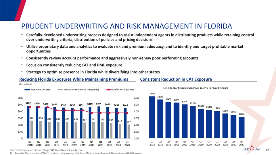LEADING POSITION IN FRAGMENTED FLORIDA MARKET rd OP E R A TI NG E NV I R ONM E NT • 3 largest state in the U.S. with 21 million people—projected to grow to S U MM AR Y 26 million by 2030 nd • 2 largest homeowners market in the U.S. - $10 billion in premium $10B+ Total addressable Florida • Highly fragmented market with national players comprising less than 20% homeowners market of premium • Significant catastrophe impact in 2020 is likely to result in meaningful rate increases in 2021 Focus on quality, • Large partner agent network, in addition to agency relationships with well-mitigated homes Allstate and GEICO • Recent AOB reform is expected to mitigate losses relative to recent years • Strong home construction and growing new housing inventory Strong partner agent throughout the state network and reputation Sources: Company website and filings, S&P Global Market Intelligence. 11 11LEADING POSITION IN FRAGMENTED FLORIDA MARKET rd OP E R A TI NG E NV I R ONM E NT • 3 largest state in the U.S. with 21 million people—projected to grow to S U MM AR Y 26 million by 2030 nd • 2 largest homeowners market in the U.S. - $10 billion in premium $10B+ Total addressable Florida • Highly fragmented market with national players comprising less than 20% homeowners market of premium • Significant catastrophe impact in 2020 is likely to result in meaningful rate increases in 2021 Focus on quality, • Large partner agent network, in addition to agency relationships with well-mitigated homes Allstate and GEICO • Recent AOB reform is expected to mitigate losses relative to recent years • Strong home construction and growing new housing inventory Strong partner agent throughout the state network and reputation Sources: Company website and filings, S&P Global Market Intelligence. 11 11