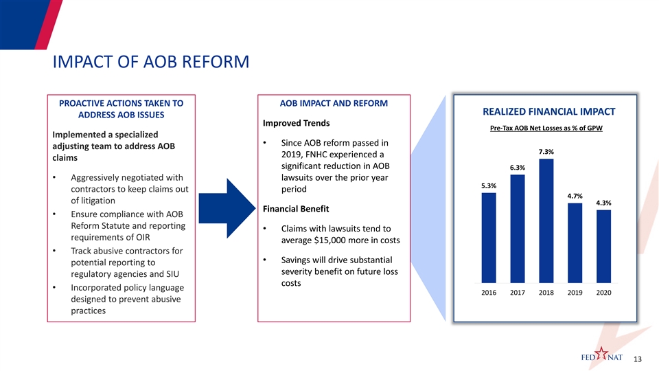 IMPACT OF AOB REFORM PROACTIVE ACTIONS TAKEN TO AOB IMPACT AND REFORM REALIZED FINANCIAL IMPACT ADDRESS AOB ISSUES Improved Trends Pre-Tax AOB Net Losses as % of GPW Implemented a specialized • Since AOB reform passed in adjusting team to address AOB 7.3% 2019, FNHC experienced a claims significant reduction in AOB 6.3% • Aggressively negotiated with lawsuits over the prior year 5.3% contractors to keep claims out period 4.7% of litigation 4.3% Financial Benefit • Ensure compliance with AOB Reform Statute and reporting • Claims with lawsuits tend to requirements of OIR average $15,000 more in costs • Track abusive contractors for • Savings will drive substantial potential reporting to severity benefit on future loss regulatory agencies and SIU costs • Incorporated policy language 2016 2017 2018 2019 2020 designed to prevent abusive practices 13 13IMPACT OF AOB REFORM PROACTIVE ACTIONS TAKEN TO AOB IMPACT AND REFORM REALIZED FINANCIAL IMPACT ADDRESS AOB ISSUES Improved Trends Pre-Tax AOB Net Losses as % of GPW Implemented a specialized • Since AOB reform passed in adjusting team to address AOB 7.3% 2019, FNHC experienced a claims significant reduction in AOB 6.3% • Aggressively negotiated with lawsuits over the prior year 5.3% contractors to keep claims out period 4.7% of litigation 4.3% Financial Benefit • Ensure compliance with AOB Reform Statute and reporting • Claims with lawsuits tend to requirements of OIR average $15,000 more in costs • Track abusive contractors for • Savings will drive substantial potential reporting to severity benefit on future loss regulatory agencies and SIU costs • Incorporated policy language 2016 2017 2018 2019 2020 designed to prevent abusive practices 13 13