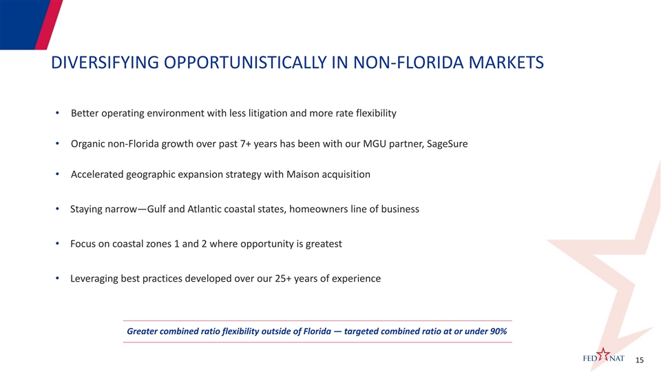 DIVERSIFYING OPPORTUNISTICALLY IN NON-FLORIDA MARKETS • Better operating environment with less litigation and more rate flexibility • Organic non-Florida growth over past 7+ years has been with our MGU partner, SageSure • Accelerated geographic expansion strategy with Maison acquisition • Staying narrow—Gulf and Atlantic coastal states, homeowners line of business • Focus on coastal zones 1 and 2 where opportunity is greatest • Leveraging best practices developed over our 25+ years of experience Greater combined ratio flexibility outside of Florida — targeted combined ratio at or under 90% 15 15DIVERSIFYING OPPORTUNISTICALLY IN NON-FLORIDA MARKETS • Better operating environment with less litigation and more rate flexibility • Organic non-Florida growth over past 7+ years has been with our MGU partner, SageSure • Accelerated geographic expansion strategy with Maison acquisition • Staying narrow—Gulf and Atlantic coastal states, homeowners line of business • Focus on coastal zones 1 and 2 where opportunity is greatest • Leveraging best practices developed over our 25+ years of experience Greater combined ratio flexibility outside of Florida — targeted combined ratio at or under 90% 15 15
