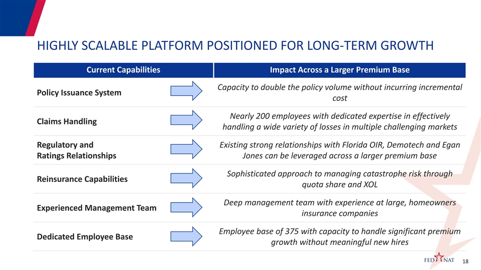 SIGNIFICANT FEE BASED INCOME (1) Overview Fee Revenue from Insurance Services Entities ($ in millions) • Insurance service entities generate significant commission and fee income 2020 increase driven by: • Provide underwriting, claims and distribution services to $179.6 • Increased volume of catastrophe claims statutory entities • Acquisition of Maison $20.2 • Commission and fee revenue based on premium and claims • Insourcing of legal and other third-party volume, as well as reinsurance spend claims and other services • Incremental revenue from CAT events • Minimal capital requirements • Flexible operating structure provides meaningful cash flow outside of statutory entities $89.5 $86.1 $84.2 $79.3 • Fees governed by contracts that have been approved by the $15.0 $6.8 $159.4 Florida OIR • Contracted rates allow for reasonable profit margin • Commission and fee revenue is generally not correlated to $77.4 underwriting results $74.5 • Non-regulated entities provide excess cash flows • Support holding company debt (currently rated ‘BBB’ by Egan Jones) 2016 2017 2018 2019 2020 • Provide capital support to statutory insurance companies, as (2) needed, including through waivers of contracted fees Fee Revenue Fee Waiver 1) Represents the following entities FNU/FNA, Century Risk Insurance Services, Insure-Link, MMI, ClaimCor, and Southeast Catastrophe Consulting Company. 17 2) Represents fees waived by the MGAs.SIGNIFICANT FEE BASED INCOME (1) Overview Fee Revenue from Insurance Services Entities ($ in millions) • Insurance service entities generate significant commission and fee income 2020 increase driven by: • Provide underwriting, claims and distribution services to $179.6 • Increased volume of catastrophe claims statutory entities • Acquisition of Maison $20.2 • Commission and fee revenue based on premium and claims • Insourcing of legal and other third-party volume, as well as reinsurance spend claims and other services • Incremental revenue from CAT events • Minimal capital requirements • Flexible operating structure provides meaningful cash flow outside of statutory entities $89.5 $86.1 $84.2 $79.3 • Fees governed by contracts that have been approved by the $15.0 $6.8 $159.4 Florida OIR • Contracted rates allow for reasonable profit margin • Commission and fee revenue is generally not correlated to $77.4 underwriting results $74.5 • Non-regulated entities provide excess cash flows • Support holding company debt (currently rated ‘BBB’ by Egan Jones) 2016 2017 2018 2019 2020 • Provide capital support to statutory insurance companies, as (2) needed, including through waivers of contracted fees Fee Revenue Fee Waiver 1) Represents the following entities FNU/FNA, Century Risk Insurance Services, Insure-Link, MMI, ClaimCor, and Southeast Catastrophe Consulting Company. 17 2) Represents fees waived by the MGAs.