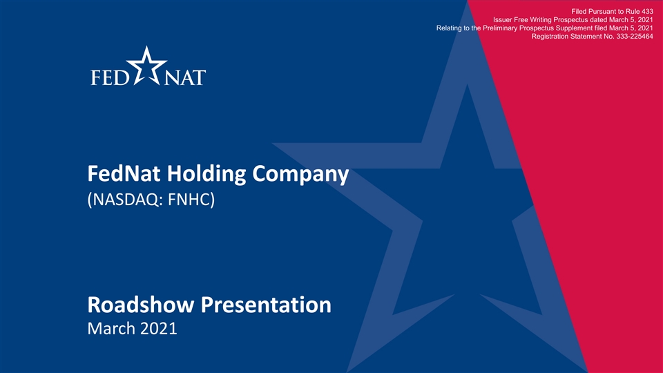 Filed Pursuant to Rule 433 Issuer Free Writing Prospectus dated March 5, 2021 Relating to the Preliminary Prospectus Supplement filed March 5, 2021 Registration Statement No. 333-225464 FedNat Holding Company (NASDAQ: FNHC) Roadshow Presentation March 2021 1Filed Pursuant to Rule 433 Issuer Free Writing Prospectus dated March 5, 2021 Relating to the Preliminary Prospectus Supplement filed March 5, 2021 Registration Statement No. 333-225464 FedNat Holding Company (NASDAQ: FNHC) Roadshow Presentation March 2021 1