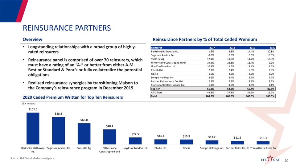 REINSURANCE PARTNERS Overview Reinsurance Partners by % of Total Ceded Premium • Longstanding relationships with a broad group of highly- Reinsurer 2017 2018 2019 2020 Berkshire Hathaway Inc. 1.6% 2.3% 14.4% 20.8% rated reinsurers Sagesure Anchor Re 0.0% 0.0% 0.0% 18.0% Swiss Re Ag 12.1% 11.9% 11.2% 13.9% • Reinsurance panel is comprised of over 70 reinsurers, which Fl Hurricane Catastrophe Fund 19.5% 22.8% 16.4% 9.9% must have a rating of an “A-” or better from either A.M. Lloyd's of London Ltd. 10.4% 11.6% 8.4% 4.6% Chubb Ltd. 2.7% 2.4% 5.5% 3.3% Best or Standard & Poor’s or fully collateralize the potential Fidelis 1.5% 2.5% 2.2% 3.2% obligations Sompo Holdings Inc. 2.6% 2.4% 2.7% 2.7% Partner Reinsurance Co. Ltd. 2.8% 2.8% 3.1% 2.3% • Realized reinsurance synergies by transitioning Maison to Transatlantic Reinsurance Co. 1.9% 3.5% 1.6% 2.1% the Company’s reinsurance program in December 2019 Top Ten 55.2% 62.2% 65.4% 80.8% All Others 44.8% 37.8% 34.6% 19.2% Total 100.0% 100.0% 100.0% 100.0% 2020 Ceded Premium Written for Top Ten Reinsurers ($ in millions) $102.0 $88.2 $68.0 $48.4 $22.5 $16.4 $15.9 $13.2 $11.5 $10.3 Berkshire Hathaway Sagesure Anchor Re Swiss Re Ag Fl Hurricane Lloyd's of London Ltd. Chubb Ltd. Fidelis Sompo Holdings Inc. Partner Reins Co Ltd Transatlantic Reins Co Inc. Catastrophe Fund Source: S&P Global Market Intelligence. 20REINSURANCE PARTNERS Overview Reinsurance Partners by % of Total Ceded Premium • Longstanding relationships with a broad group of highly- Reinsurer 2017 2018 2019 2020 Berkshire Hathaway Inc. 1.6% 2.3% 14.4% 20.8% rated reinsurers Sagesure Anchor Re 0.0% 0.0% 0.0% 18.0% Swiss Re Ag 12.1% 11.9% 11.2% 13.9% • Reinsurance panel is comprised of over 70 reinsurers, which Fl Hurricane Catastrophe Fund 19.5% 22.8% 16.4% 9.9% must have a rating of an “A-” or better from either A.M. Lloyd's of London Ltd. 10.4% 11.6% 8.4% 4.6% Chubb Ltd. 2.7% 2.4% 5.5% 3.3% Best or Standard & Poor’s or fully collateralize the potential Fidelis 1.5% 2.5% 2.2% 3.2% obligations Sompo Holdings Inc. 2.6% 2.4% 2.7% 2.7% Partner Reinsurance Co. Ltd. 2.8% 2.8% 3.1% 2.3% • Realized reinsurance synergies by transitioning Maison to Transatlantic Reinsurance Co. 1.9% 3.5% 1.6% 2.1% the Company’s reinsurance program in December 2019 Top Ten 55.2% 62.2% 65.4% 80.8% All Others 44.8% 37.8% 34.6% 19.2% Total 100.0% 100.0% 100.0% 100.0% 2020 Ceded Premium Written for Top Ten Reinsurers ($ in millions) $102.0 $88.2 $68.0 $48.4 $22.5 $16.4 $15.9 $13.2 $11.5 $10.3 Berkshire Hathaway Sagesure Anchor Re Swiss Re Ag Fl Hurricane Lloyd's of London Ltd. Chubb Ltd. Fidelis Sompo Holdings Inc. Partner Reins Co Ltd Transatlantic Reins Co Inc. Catastrophe Fund Source: S&P Global Market Intelligence. 20