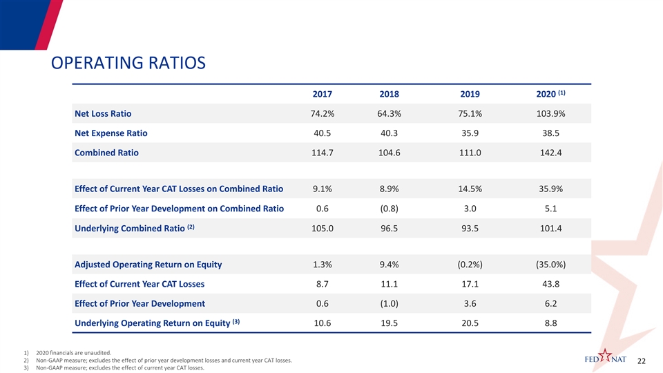 OPERATING RATIOS (1) 2017 2018 2019 2020 Net Loss Ratio 74.2% 64.3% 75.1% 103.9% Net Expense Ratio 40.5 40.3 35.9 38.5 Combined Ratio 114.7 104.6 111.0 142.4 Effect of Current Year CAT Losses on Combined Ratio 9.1% 8.9% 14.5% 35.9% Effect of Prior Year Development on Combined Ratio 0.6 (0.8) 3.0 5.1 (2) Underlying Combined Ratio 105.0 96.5 93.5 101.4 Adjusted Operating Return on Equity 1.3% 9.4% (0.2%) (35.0%) Effect of Current Year CAT Losses 8.7 11.1 17.1 43.8 Effect of Prior Year Development 0.6 (1.0) 3.6 6.2 (3) Underlying Operating Return on Equity 10.6 19.5 20.5 8.8 1) 2020 financials are unaudited. 2) Non-GAAP measure; excludes the effect of prior year development losses and current year CAT losses. 22 22 3) Non-GAAP measure; excludes the effect of current year CAT losses. OPERATING RATIOS (1) 2017 2018 2019 2020 Net Loss Ratio 74.2% 64.3% 75.1% 103.9% Net Expense Ratio 40.5 40.3 35.9 38.5 Combined Ratio 114.7 104.6 111.0 142.4 Effect of Current Year CAT Losses on Combined Ratio 9.1% 8.9% 14.5% 35.9% Effect of Prior Year Development on Combined Ratio 0.6 (0.8) 3.0 5.1 (2) Underlying Combined Ratio 105.0 96.5 93.5 101.4 Adjusted Operating Return on Equity 1.3% 9.4% (0.2%) (35.0%) Effect of Current Year CAT Losses 8.7 11.1 17.1 43.8 Effect of Prior Year Development 0.6 (1.0) 3.6 6.2 (3) Underlying Operating Return on Equity 10.6 19.5 20.5 8.8 1) 2020 financials are unaudited. 2) Non-GAAP measure; excludes the effect of prior year development losses and current year CAT losses. 22 22 3) Non-GAAP measure; excludes the effect of current year CAT losses.
