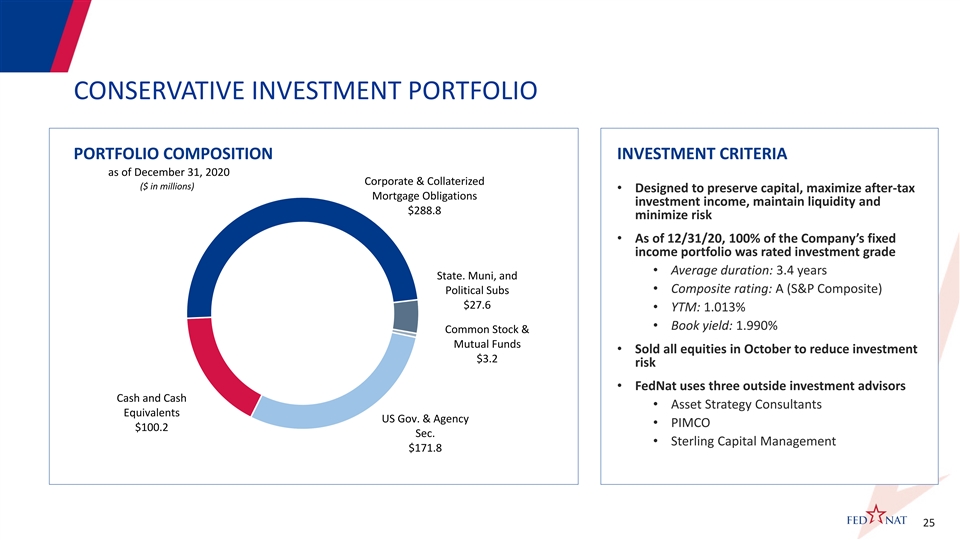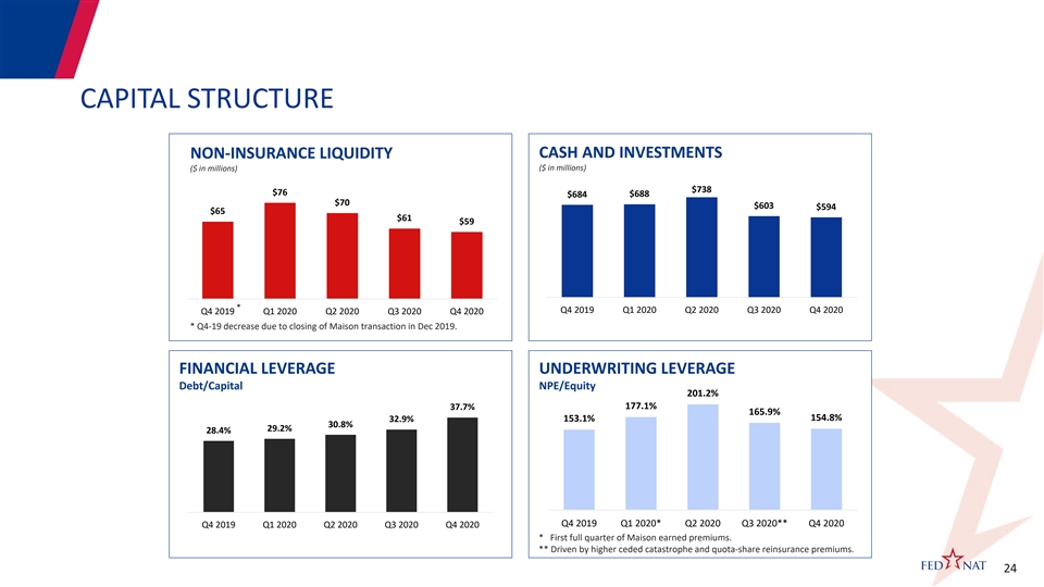 CAPITAL STRUCTURE CASH AND INVESTMENTS NON-INSURANCE LIQUIDITY ($ in millions) ($ in millions) $738 $76 $688 $684 $70 $603 $594 $65 $61 $59 * Q4 2019 Q1 2020 Q2 2020 Q3 2020 Q4 2020 Q4 2019 Q1 2020 Q2 2020 Q3 2020 Q4 2020 * Q4-19 decrease due to closing of Maison transaction in Dec 2019. FINANCIAL LEVERAGE UNDERWRITING LEVERAGE Debt/Capital NPE/Equity 201.2% 177.1% 37.7% 165.9% 154.8% 32.9% 153.1% 30.8% 29.2% 28.4% Q4 2019 Q1 2020* Q2 2020 Q3 2020** Q4 2020 Q4 2019 Q1 2020 Q2 2020 Q3 2020 Q4 2020 * First full quarter of Maison earned premiums. ** Driven by higher ceded catastrophe and quota-share reinsurance premiums. 24 24CAPITAL STRUCTURE CASH AND INVESTMENTS NON-INSURANCE LIQUIDITY ($ in millions) ($ in millions) $738 $76 $688 $684 $70 $603 $594 $65 $61 $59 * Q4 2019 Q1 2020 Q2 2020 Q3 2020 Q4 2020 Q4 2019 Q1 2020 Q2 2020 Q3 2020 Q4 2020 * Q4-19 decrease due to closing of Maison transaction in Dec 2019. FINANCIAL LEVERAGE UNDERWRITING LEVERAGE Debt/Capital NPE/Equity 201.2% 177.1% 37.7% 165.9% 154.8% 32.9% 153.1% 30.8% 29.2% 28.4% Q4 2019 Q1 2020* Q2 2020 Q3 2020** Q4 2020 Q4 2019 Q1 2020 Q2 2020 Q3 2020 Q4 2020 * First full quarter of Maison earned premiums. ** Driven by higher ceded catastrophe and quota-share reinsurance premiums. 24 24