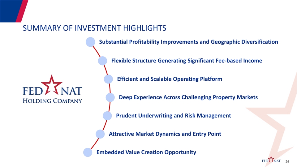 DISCLAIMER FedNat Holding Company (the “Company” or “FedNat”) is conducting an offering of common stock. This presentation is for informational purposes only and shall not constitute an offer to sell or a solicitation of an offer to buy any securities of the Company, nor shall there be any sale of such securities, in any state or other jurisdiction in which an offer, solicitation or sale would be unlawful prior to registration or qualification under the securities laws of any such state or other jurisdiction in the absence of an applicable exemption from such registration or qualification requirements. Neither the Securities and Exchange Commission (the “SEC”) nor any other regulatory body has approved or disapproved of the securities of the Company or passed upon the accuracy or adequacy of this presentation. The Company has filed a registration statement and a preliminary prospectus supplement (which is subject to completion) with the SEC for the offering of common stock to which this communication relates. Before you invest, you should read the prospectus in that registration statement, the preliminary prospectus supplement, the final prospectus supplement (when available) and the other documents the Company has filed or will file with the SEC for more complete information about the Company and the offering of common stock. You may get these documents for free by visiting the SEC website at www.sec.gov. Alternatively, FedNat or the underwriter will arrange to send you the prospectus and prospectus supplement if you request it by calling toll free at 866-805-4128. Forward-Looking Statements This presentation contains forward-looking statements. We intend these statements to be covered by the safe harbor provision for forward-looking statements contained in the Private Securities Litigation Reform Act of 1995. These forward-looking statements include, but are not limited to, statements about the Company’s expectations regarding the completion, terms, size, and timing of the public offering, and with respect to granting the underwriters a 30-day option to purchase additional shares. These statements are often, but not always, made through the use of words or phrases such as “may,” “should,” “could,” “predict,” “potential,” “believe,” “expect,” “continue,” “will,” “anticipate,” “estimate,” “intend” and “projection,” or the negative version of those words or other comparable of a future or forward-looking nature. These forward-looking statements are not historical facts, and are based on current expectations, estimates and projections about our industry, management’s beliefs and certain assumptions made by management, many of which, by their nature, are inherently uncertain and beyond our control. Accordingly, we caution you that any such forward-looking statements are not guarantees of future performance and are subject to risks, assumptions and uncertainties that are difficult to predict. Although we believe that the expectations reflected in these forward-looking statements are reasonable as of the date made, actual results may prove to be materially different from the results expressed or implied by the forward-looking statements. For factors, risks and uncertainties that could cause our actual results to differ materially from estimates and projections contained in forward-looking statements, please read the “Risk Factors” sections contained in our reports to the SEC and in the preliminary and final prospectus supplement. You should not place undue reliance on any such forward-looking statements. Any forward-looking statement speaks only as of the date on which it is made, and we do not undertake any obligation to publicly update or review any forward-looking statement, whether as a result of new information, future developments or otherwise. New factors emerge from time to time, and it is not possible for us to predict which will arise. Use of Non-GAAP Financial Measures In addition to financial measures presented in accordance with generally accepted accounting principles in the United States of America (GAAP), this presentation contains certain non-GAAP financial measures. These non- GAAP financial measures adjust GAAP financial measures, which our management uses when evaluating net income from our core business, capital utilization and adequacy. The specific non-GAAP financial measures used are adjusted total revenue, efficiency ratio, and tangible book value per common share. The presentation of this non-GAAP financial information is not intended to be considered in isolation or as a substitute for any measure prepared in accordance with GAAP. Investors should note that, because there are no standardized definitions for the calculations as well as the results, our calculations may not be comparable to other similarly- titled measures presented by other companies. Also, there may be limits in the usefulness of these measures to investors. As a result, we encourage readers to consider our consolidated financial statements in their entirety and not to rely on any single financial measures. Industry and Other Data Certain market and industry data included in this presentation have been obtained from third-party sources that the Company believes to be reliable. Market estimates are calculated by using independent industry publications, government publications, reports by market research firms and third-party forecasts in conjunction with the Company’s assumptions about its markets. Some data are also based on the Company’s good faith estimates, which may be derived from its review of internal surveys and from independent sources. The Company believes these estimates to be reasonable based on the information available to it as of the date of this presentation. However, the Company has not independently verified such third-party information and cannot assure the recipient of its accuracy or completeness. All br