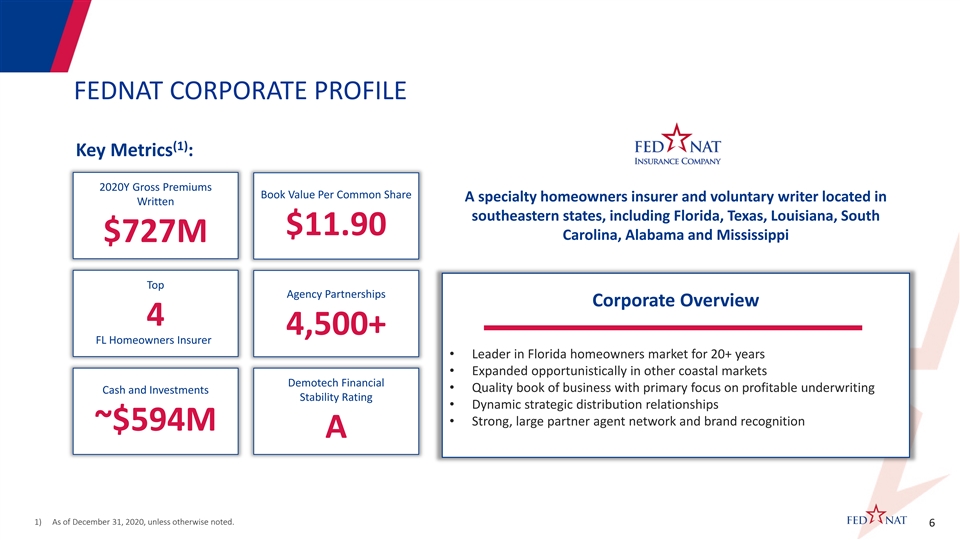 FEDNAT CORPORATE PROFILE (1) Key Metrics : 2020Y Gross Premiums Book Value Per Common Share A specialty homeowners insurer and voluntary writer located in Written southeastern states, including Florida, Texas, Louisiana, South $11.90 Carolina, Alabama and Mississippi $727M Top Agency Partnerships Corporate Overview 4 4,500+ FL Homeowners Insurer • Leader in Florida homeowners market for 20+ years • Expanded opportunistically in other coastal markets Demotech Financial • Quality book of business with primary focus on profitable underwriting Cash and Investments Stability Rating • Dynamic strategic distribution relationships • Strong, large partner agent network and brand recognition ~$594M A 1) As of December 31, 2020, unless otherwise noted. 6 6FEDNAT CORPORATE PROFILE (1) Key Metrics : 2020Y Gross Premiums Book Value Per Common Share A specialty homeowners insurer and voluntary writer located in Written southeastern states, including Florida, Texas, Louisiana, South $11.90 Carolina, Alabama and Mississippi $727M Top Agency Partnerships Corporate Overview 4 4,500+ FL Homeowners Insurer • Leader in Florida homeowners market for 20+ years • Expanded opportunistically in other coastal markets Demotech Financial • Quality book of business with primary focus on profitable underwriting Cash and Investments Stability Rating • Dynamic strategic distribution relationships • Strong, large partner agent network and brand recognition ~$594M A 1) As of December 31, 2020, unless otherwise noted. 6 6