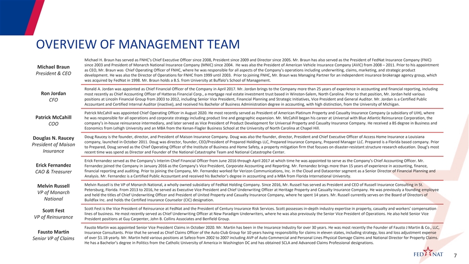 OVERVIEW OF MANAGEMENT TEAM Michael H. Braun has served as FNHC’s Chief Executive Officer since 2008, President since 2009 and Director since 2005. Mr. Braun has also served as the President of FedNat Insurance Company (FNIC) since 2003 and President of Monarch National Insurance Company (MNIC) since 2004. He was also the President of American Vehicle Insurance Company (AVIC) from 2008 – 2011. Prior to his appointment Michael Braun as CEO, Mr. Braun was Chief Operating Officer of FNHC, where he was responsible for all aspects of the Company’s operations including underwriting, claims, marketing, and strategic product President & CEO development. He was also the Director of Operations for FNHC from 1999 until 2003. Prior to joining FNHC, Mr. Braun was Managing Partner for an independent insurance brokerage agency group, which was acquired by FedNat in 1998. Mr. Braun holds a B.S. from University at Buffalo’s School of Management. Ronald A. Jordan was appointed as Chief Financial Officer of the Company in April 2017. Mr. Jordan brings to the Company more than 25 years of experience in accounting and financial reporting, including Ron Jordan most recently as Chief Accounting Officer of Hatteras Financial Corp., a mortgage real estate investment trust based in Winston-Salem, North Carolina. Prior to that position, Mr. Jordan held various positions at Lincoln Financial Group from 2003 to 2012, including Senior Vice President, Financial Planning and Strategic Initiatives, Vice President and General Auditor. Mr. Jordan is a Certified Public CFO Accountant and Certified Internal Auditor (inactive), and received his Bachelor of Business Administration degree in accounting, with high distinction, from the University of Michigan. Patrick McCahill was appointed Chief Operating Officer in August 2020. He most recently served as President of American Platinum Property and Casualty Insurance Company (a subsidiary of UIH), where Patrick McCahill he was responsible for all operations and corporate strategy including product line and geographic expansion. Mr. McCahill began his career at Universal with Blue Atlantic Reinsurance Corporation, the company’s in-house reinsurance intermediary, and later served as Vice President of Product Development for Universal Property and Casualty Insurance Company. He received a BS degree in Business and COO Economics from Lehigh University and an MBA from the Kenan-Flagler Business School at the University of North Carolina at Chapel Hill. Doug Raucey is the founder, director, and President of Maison Insurance Company. Doug was also the founder, director, President and Chief Executive Officer of Access Home Insurance a Louisiana Douglas N. Raucey company, launched in October 2011. Doug was director, founder, CEO/President of Prepared Holdings LLC, Prepared Insurance Company, Prepared Manager LLC. Prepared is a Florida based company. Prior President of Maison to Prepared, Doug served as the Chief Operating Officer of the Institute of Business and Home Safety, a property mitigation firm that focuses on disaster-resistant structure research education. Doug’s most Insurance recent time was spend as Director and Founder of the National Catastrophe Team and National Catastrophe Center. Erick Fernandez served as the Company’s Interim Chief Financial Officer from June 2016 through April 2017 at which time he was appointed to serve as the Company’s Chief Accounting Officer. Mr. Erick Fernandez Fernandez joined the Company in January 2016 as the Company’s Vice President, Corporate Accounting and Reporting. Mr. Fernandez brings more than 15 years of experience in accounting, finance, financial reporting and auditing. Prior to joining the Company, Mr. Fernandez worked for Verizon Communications, Inc. in the Cloud and Datacenter segment as a Senior Director of Financial Planning and CAO & Treasurer Analysis. Mr. Fernandez is a Certified Public Accountant and received his Bachelor’s degree in accounting and a MBA from Florida International University. Melvin Russell is the VP of Monarch National, a wholly owned subsidiary of FedNat Holding Company. Since 2016, Mr. Russell has served as President and CEO of Russell Insurance Consulting in St. Melvin Russell Petersburg, Florida. From 2013 to 2016, he served as Executive Vice President and Chief Underwriting Officer at Heritage Property and Casualty Insurance Company. He was previously a founding employee VP of Monarch and held the titles of Chief Underwriting Officer and President of United Property and Casualty Insurance Company, where he spent 14 years. Mr. Russell currently serves on the Board of Directors of National Buildfax Inc. and holds the Certified Insurance Counselor (CIC) designation. Scott Fest is the Vice President of Reinsurance at FedNat and the President of Century Insurance Risk Services. Scott possesses in-depth industry expertise in property, casualty and workers’ compensation Scott Fest lines of business. He most recently served as Chief Underwriting Officer at New Paradigm Underwriters, where he was also previously the Senior Vice President of Operations. He also held Senior Vice VP of Reinsurance President positions at Guy Carpenter, John B. Collins Associates and Benfield Group. Fausto Martin was appointed Senior Vice President Claims in October 2020. Mr. Martin has been in the Insurance Industry for over 30 years. He was most recently the Founder of Fausto J Martin & Co., LLC, Fausto Martin Insurance Consultants. Prior that he served as Chief Claims Officer of the Auto Club Group for 10 years having responsibility for claims in eleven states, including strategy, loss and loss adjustment expense of over $1.1B yearly. Mr. Martin held various positions at Safeco from 2002 to 2007 including AVP of Auto Commercial and Personal Lines Physical Damage Claims and National Director for Property Claims. Senior VP of Claims He has a Bachelor’s degree in Politics from the Catholic University of Ameri