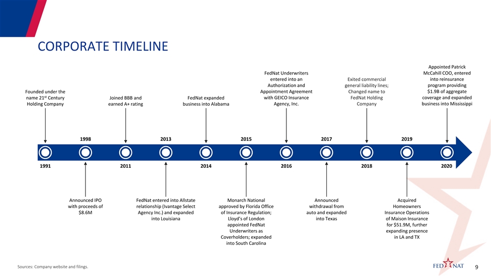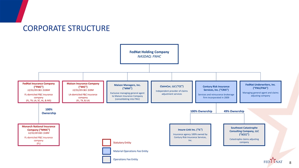 CORPORATE STRUCTURE FedNat Holding Company NASDAQ: FNHC FedNat Insurance Company Maison Insurance Company FedNat Underwriters, Inc. Maison Managers, Inc. ClaimCor, LLC (“CC”) Century Risk Insurance (“FNIC”) (“MIC”) (“FNU/FNA”) (“MMI”) 12/31/20 C&S: $106M 12/31/20 C&S: $39M Services, Inc. (“CRIS”) Independent provider of claims Managing general agent and claims Exclusive managing general agent adjustment services FL-domiciled P&C insurance LA-domiciled P&C insurance Services and reinsurance brokerage adjusting company to Maison Insurance Company company company firm incorporated in 2009 (consolidating into FNU) (FL, TX, LA, SC, AL, & MS) (FL, TX, & LA) 100% 100% Ownership 49% Ownership Ownership Monarch National Insurance Southeast Catastrophe Company (“MNIC”) Insure-Link Inc. (“IL”) Consulting Company, LLC 12/31/20 C&S: $18M Insurance agency 100% owned by (“SCCC”) FL-domiciled P&C insurance Century Risk Insurance Services, Catastrophe claims adjusting Inc. company company Statutory Entity (FL) Material Operations Fee Entity Operations Fee Entity 8CORPORATE STRUCTURE FedNat Holding Company NASDAQ: FNHC FedNat Insurance Company Maison Insurance Company FedNat Underwriters, Inc. Maison Managers, Inc. ClaimCor, LLC (“CC”) Century Risk Insurance (“FNIC”) (“MIC”) (“FNU/FNA”) (“MMI”) 12/31/20 C&S: $106M 12/31/20 C&S: $39M Services, Inc. (“CRIS”) Independent provider of claims Managing general agent and claims Exclusive managing general agent adjustment services FL-domiciled P&C insurance LA-domiciled P&C insurance Services and reinsurance brokerage adjusting company to Maison Insurance Company company company firm incorporated in 2009 (consolidating into FNU) (FL, TX, LA, SC, AL, & MS) (FL, TX, & LA) 100% 100% Ownership 49% Ownership Ownership Monarch National Insurance Southeast Catastrophe Company (“MNIC”) Insure-Link Inc. (“IL”) Consulting Company, LLC 12/31/20 C&S: $18M Insurance agency 100% owned by (“SCCC”) FL-domiciled P&C insurance Century Risk Insurance Services, Catastrophe claims adjusting Inc. company company Statutory Entity (FL) Material Operations Fee Entity Operations Fee Entity 8