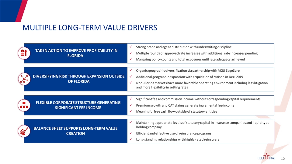 CORPORATE TIMELINE Appoi nted Patrick FedNat Underwriters McCahill COO, entered entered i nto an i nto rei nsurance Exi ted commercial Authori zation and program providing general l iability l ines; Appoi ntment Agreement $1.9B of aggregate Founded under the Changed name to st coverage and expanded name 21 Century Joi ned BBB and FedNat expanded wi th GEICO Insurance FedNat Hol ding busi ness i nto Mississippi Hol di ng Company earned A+ rati ng busi ness i nto Al abama Agency, Inc. Company 1998 2013 2015 2017 2019 1991 2011 2014 2016 2018 2020 Announced IPO FedNat entered i nto Al l state Monarch National Announced Acquired wi th proceeds of rel ationship (Ivantage Sel ect approved by Fl orida Office withdrawal from Homeowners $8.6M Agency Inc.) and expanded of Insurance Regulation; auto and expanded Insurance Operations i nto Loui siana Lloyd’s of London i nto Texas of Mai son Insurance appointed FedNat for $51.9M, further Underwri ters as expanding presence Coverholders; expanded i n LA and TX i nto South Carolina Sources: Company website and filings. 9CORPORATE TIMELINE Appoi nted Patrick FedNat Underwriters McCahill COO, entered entered i nto an i nto rei nsurance Exi ted commercial Authori zation and program providing general l iability l ines; Appoi ntment Agreement $1.9B of aggregate Founded under the Changed name to st coverage and expanded name 21 Century Joi ned BBB and FedNat expanded wi th GEICO Insurance FedNat Hol ding busi ness i nto Mississippi Hol di ng Company earned A+ rati ng busi ness i nto Al abama Agency, Inc. Company 1998 2013 2015 2017 2019 1991 2011 2014 2016 2018 2020 Announced IPO FedNat entered i nto Al l state Monarch National Announced Acquired wi th proceeds of rel ationship (Ivantage Sel ect approved by Fl orida Office withdrawal from Homeowners $8.6M Agency Inc.) and expanded of Insurance Regulation; auto and expanded Insurance Operations i nto Loui siana Lloyd’s of London i nto Texas of Mai son Insurance appointed FedNat for $51.9M, further Underwri ters as expanding presence Coverholders; expanded i n LA and TX i nto South Carolina Sources: Company website and filings. 9