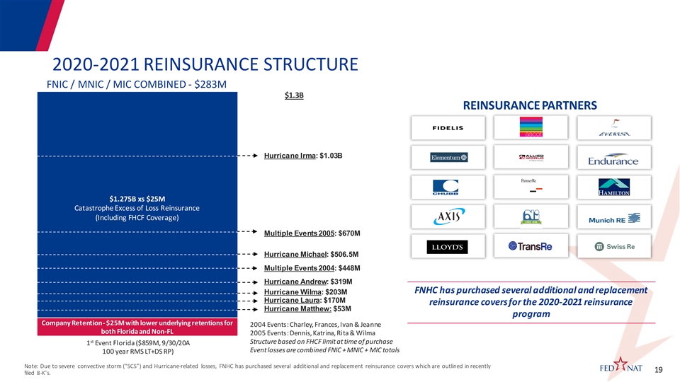 2020-2021 REINSURANCE STRUCTURE FNIC / MNIC / MIC COMBINED - $283M $1.3B REINSURANCE PARTNERS Hurricane Irma: $1.03B $1.275B xs $25M Catastrophe Excess of Loss Reinsurance (Including FHCF Coverage) Multiple Events 2005: $670M Hurricane Michael: $506.5M Multiple Events 2004: $448M Hurricane Andrew: $319M FNHC has purchased several additional and replacement Hurricane Wilma: $203M Hurricane Laura: $170M reinsurance covers for the 2020-2021 reinsurance Hurricane Matthew: $53M program Company Retention - $25M with lower underlying retentions for 2004 Events: Charley, Frances, Ivan & Jeanne both Florida and Non-FL 2005 Events: Dennis, Katrina, Ri ta & Wilma st Structure based on FHCF limit at time of purchase 1 Event Fl orida ($859M, 9/30/20A Event losses are combined FNIC + MNIC + MIC totals 100 year RMS LT+DS RP) Note: Due to severe convective storm (“SCS”) and Hurricane-related losses, FNHC has purchased several additional and replacement reinsurance covers which are outlined in recently 19 19 filed 8-K’s. 2020-2021 REINSURANCE STRUCTURE FNIC / MNIC / MIC COMBINED - $283M $1.3B REINSURANCE PARTNERS Hurricane Irma: $1.03B $1.275B xs $25M Catastrophe Excess of Loss Reinsurance (Including FHCF Coverage) Multiple Events 2005: $670M Hurricane Michael: $506.5M Multiple Events 2004: $448M Hurricane Andrew: $319M FNHC has purchased several additional and replacement Hurricane Wilma: $203M Hurricane Laura: $170M reinsurance covers for the 2020-2021 reinsurance Hurricane Matthew: $53M program Company Retention - $25M with lower underlying retentions for 2004 Events: Charley, Frances, Ivan & Jeanne both Florida and Non-FL 2005 Events: Dennis, Katrina, Ri ta & Wilma st Structure based on FHCF limit at time of purchase 1 Event Fl orida ($859M, 9/30/20A Event losses are combined FNIC + MNIC + MIC totals 100 year RMS LT+DS RP) Note: Due to severe convective storm (“SCS”) and Hurricane-related losses, FNHC has purchased several additional and replacement reinsurance covers which are outlined in recently 19 19 filed 8-K’s.