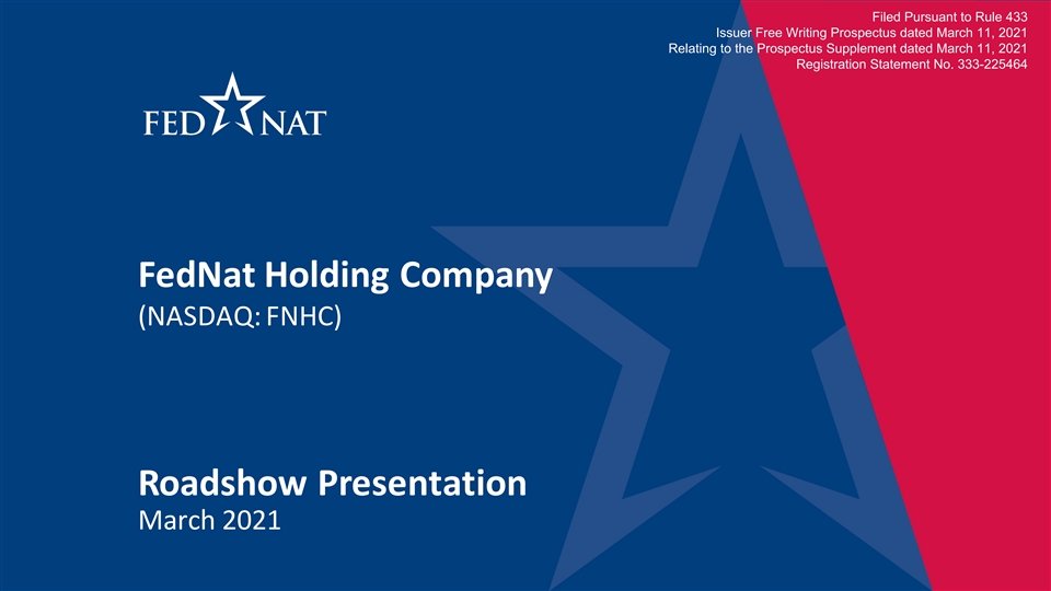 Filed Pursuant to Rule 433 Issuer Free Writing Prospectus dated March 11, 2021 Relating to the Prospectus Supplement dated March 11, 2021 Registration Statement No. 333-225464 FedNat Holding Company (NASDAQ: FNHC) Roadshow Presentation March 2021 1Filed Pursuant to Rule 433 Issuer Free Writing Prospectus dated March 11, 2021 Relating to the Prospectus Supplement dated March 11, 2021 Registration Statement No. 333-225464 FedNat Holding Company (NASDAQ: FNHC) Roadshow Presentation March 2021 1