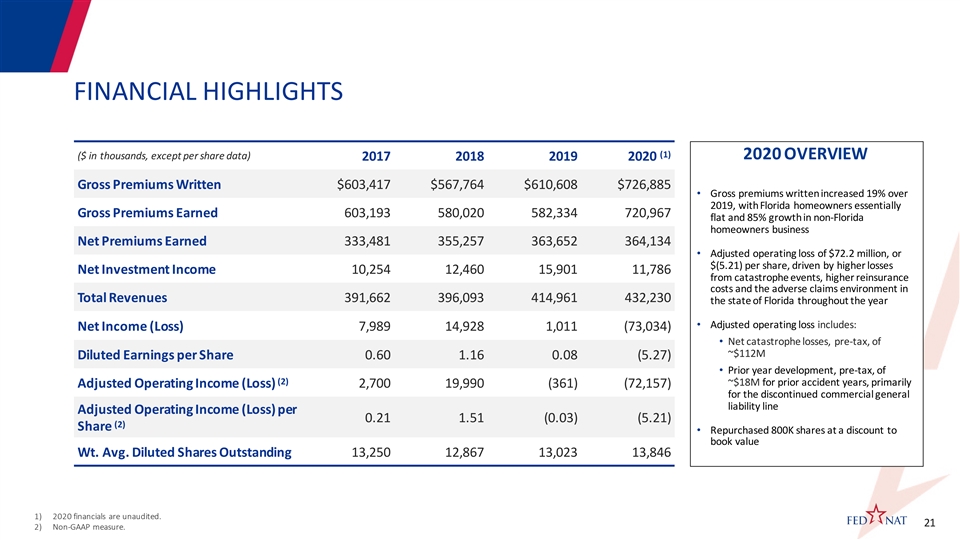 FINANCIAL HIGHLIGHTS (1) ($ in thousands, except per share data) 2020 OVERVIEW 2017 2018 2019 2020 Gross Premiums Written $603,417 $567,764 $610,608 $726,885 • Gross premiums written increased 19% over 2019, with Florida homeowners essentially Gross Premiums Earned 603,193 580,020 582,334 720,967 flat and 85% growth in non-Florida homeowners business Net Premiums Earned 333,481 355,257 363,652 364,134 • Adjusted operating loss of $72.2 million, or $(5.21) per share, driven by higher losses Net Investment Income 10,254 12,460 15,901 11,786 from catastrophe events, higher reinsurance costs and the adverse claims environment in Total Revenues 391,662 396,093 414,961 432,230 the state of Florida throughout the year • Adjusted operating loss includes: Net Income (Loss) 7,989 14,928 1,011 (73,034) • Net catastrophe losses, pre-tax, of ~$112M Diluted Earnings per Share 0.60 1.16 0.08 (5.27) • Prior year development, pre-tax, of (2) ~$18M for prior accident years, primarily Adjusted Operating Income (Loss) 2,700 19,990 (361) (72,157) for the discontinued commercial general liability line Adjusted Operating Income (Loss) per 0.21 1.51 (0.03) (5.21) (2) Share • Repurchased 800K shares at a discount to book value Wt. Avg. Diluted Shares Outstanding 13,250 12,867 13,023 13,846 1) 2020 financials are unaudited. 21 21 2) Non-GAAP measure.FINANCIAL HIGHLIGHTS (1) ($ in thousands, except per share data) 2020 OVERVIEW 2017 2018 2019 2020 Gross Premiums Written $603,417 $567,764 $610,608 $726,885 • Gross premiums written increased 19% over 2019, with Florida homeowners essentially Gross Premiums Earned 603,193 580,020 582,334 720,967 flat and 85% growth in non-Florida homeowners business Net Premiums Earned 333,481 355,257 363,652 364,134 • Adjusted operating loss of $72.2 million, or $(5.21) per share, driven by higher losses Net Investment Income 10,254 12,460 15,901 11,786 from catastrophe events, higher reinsurance costs and the adverse claims environment in Total Revenues 391,662 396,093 414,961 432,230 the state of Florida throughout the year • Adjusted operating loss includes: Net Income (Loss) 7,989 14,928 1,011 (73,034) • Net catastrophe losses, pre-tax, of ~$112M Diluted Earnings per Share 0.60 1.16 0.08 (5.27) • Prior year development, pre-tax, of (2) ~$18M for prior accident years, primarily Adjusted Operating Income (Loss) 2,700 19,990 (361) (72,157) for the discontinued commercial general liability line Adjusted Operating Income (Loss) per 0.21 1.51 (0.03) (5.21) (2) Share • Repurchased 800K shares at a discount to book value Wt. Avg. Diluted Shares Outstanding 13,250 12,867 13,023 13,846 1) 2020 financials are unaudited. 21 21 2) Non-GAAP measure.