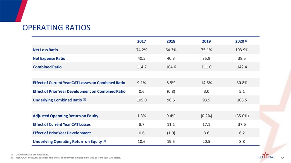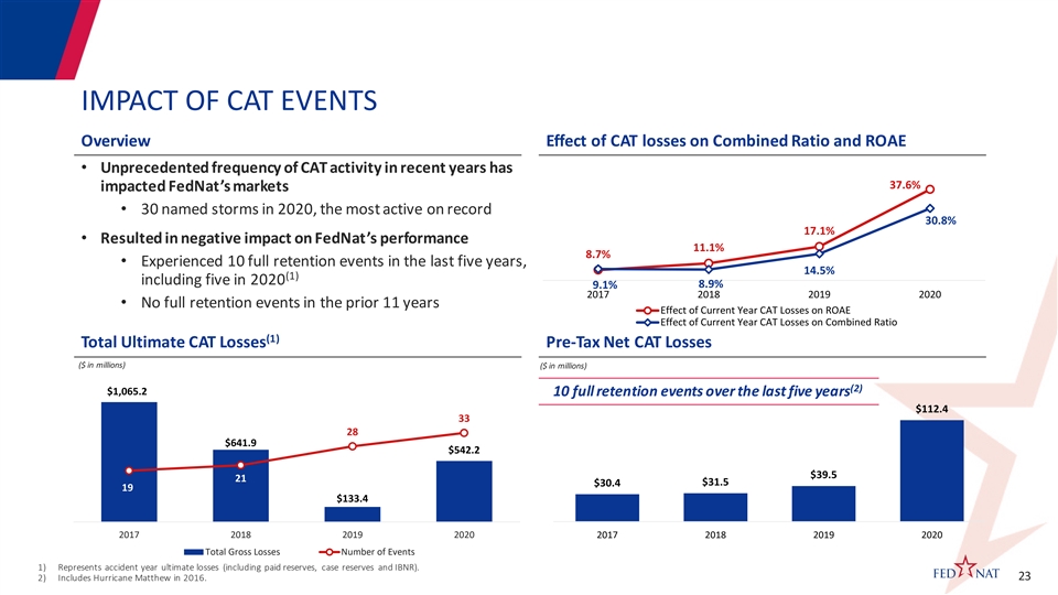 OPERATING RATIOS (1) 2017 2018 2019 2020 Net Loss Ratio 74.2% 64.3% 75.1% 103.9% Net Expense Ratio 40.5 40.3 35.9 38.5 Combined Ratio 114.7 104.6 111.0 142.4 Effect of Current Year CAT Losses on Combined Ratio 9.1% 8.9% 14.5% 30.8% Effect of Prior Year Development on Combined Ratio 0.6 (0.8) 3.0 5.1 (2) Underlying Combined Ratio 105.0 96.5 93.5 106.5 Adjusted Operating Return on Equity 1.3% 9.4% (0.2%) (35.0%) Effect of Current Year CAT Losses 8.7 11.1 17.1 37.6 Effect of Prior Year Development 0.6 (1.0) 3.6 6.2 (2) Underlying Operating Return on Equity 10.6 19.5 20.5 8.8 1) 2020 financials are unaudited. 2) Non-GAAP measure; excludes the effect of prior year development and current year CAT losses. 22 22OPERATING RATIOS (1) 2017 2018 2019 2020 Net Loss Ratio 74.2% 64.3% 75.1% 103.9% Net Expense Ratio 40.5 40.3 35.9 38.5 Combined Ratio 114.7 104.6 111.0 142.4 Effect of Current Year CAT Losses on Combined Ratio 9.1% 8.9% 14.5% 30.8% Effect of Prior Year Development on Combined Ratio 0.6 (0.8) 3.0 5.1 (2) Underlying Combined Ratio 105.0 96.5 93.5 106.5 Adjusted Operating Return on Equity 1.3% 9.4% (0.2%) (35.0%) Effect of Current Year CAT Losses 8.7 11.1 17.1 37.6 Effect of Prior Year Development 0.6 (1.0) 3.6 6.2 (2) Underlying Operating Return on Equity 10.6 19.5 20.5 8.8 1) 2020 financials are unaudited. 2) Non-GAAP measure; excludes the effect of prior year development and current year CAT losses. 22 22