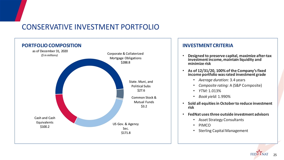 CAPITAL STRUCTURE CASH AND INVESTMENTS NON-INSURANCE LIQUIDITY ($ in millions) ($ in millions) $738 $76 $688 $684 $70 $603 $594 $65 $61 $59 * Q4 2019 Q1 2020 Q2 2020 Q3 2020 Q4 2020 Q4 2019 Q1 2020 Q2 2020 Q3 2020 Q4 2020 * Q4-19 decrease due to closing of Maison transaction in Dec 2019. FINANCIAL LEVERAGE UNDERWRITING LEVERAGE Debt/Capital NPE/Equity 201.2% 177.1% 37.7% 165.9% 154.8% 32.9% 153.1% 30.8% 29.2% 28.4% Q4 2019 Q1 2020* Q2 2020 Q3 2020** Q4 2020 Q4 2019 Q1 2020 Q2 2020 Q3 2020 Q4 2020 * First full quarter of Maison earned premiums. ** Driven by higher ceded catastrophe and quota-share reinsurance premiums. 24 24CAPITAL STRUCTURE CASH AND INVESTMENTS NON-INSURANCE LIQUIDITY ($ in millions) ($ in millions) $738 $76 $688 $684 $70 $603 $594 $65 $61 $59 * Q4 2019 Q1 2020 Q2 2020 Q3 2020 Q4 2020 Q4 2019 Q1 2020 Q2 2020 Q3 2020 Q4 2020 * Q4-19 decrease due to closing of Maison transaction in Dec 2019. FINANCIAL LEVERAGE UNDERWRITING LEVERAGE Debt/Capital NPE/Equity 201.2% 177.1% 37.7% 165.9% 154.8% 32.9% 153.1% 30.8% 29.2% 28.4% Q4 2019 Q1 2020* Q2 2020 Q3 2020** Q4 2020 Q4 2019 Q1 2020 Q2 2020 Q3 2020 Q4 2020 * First full quarter of Maison earned premiums. ** Driven by higher ceded catastrophe and quota-share reinsurance premiums. 24 24