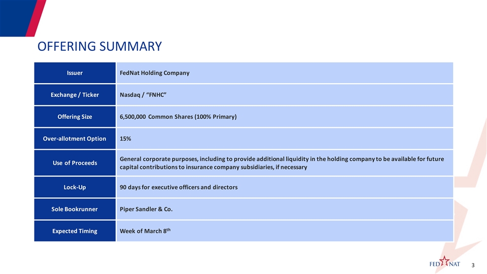 DISCLAIMER FedNat Holding Company (the “Company” or “FedNat”) is conducting an offering of common stock. This presentation is for informational purposes only and shall not constitute an offer to sell or a solicitation of an offer to buy any securities of the Company, nor shall there be any sale of such securities, in any state or other jurisdiction in which an offer, solicitation or sale would be unlawful prior to registration or qualification under the securities laws of any such state or other jurisdiction in the absence of an applicable exemption from such registration or qualification requirements. Neither the Securities and Exchange Commission (the “SEC”) nor any other regulatory body has approved or disapproved of the securities of the Company or passed upon the accuracy or adequacy of this presentation. The Company has filed a registration statement and a preliminary prospectus supplement (which is subject to completion) with the SEC for the offering of common stock to which this communication relates. Before you invest, you should read the prospectus in that registration statement, the preliminary prospectus supplement, the final prospectus supplement (when available) and the other documents the Company has filed or will file with the SEC for more complete information about the Company and the offering of common stock. You may get these documents for free by visiting the SEC website at www.sec.gov. Alternatively, FedNat or the underwriter will arrange to send you the prospectus and prospectus supplement if you request it by calling toll free at 866-805-4128. Forward-Looking Statements This presentation contains forward-looking statements. We intend these statements to be covered by the safe harbor provision for forward-looking statements contained in the Private Securities Litigation Reform Act of 1995. These forward-looking statements include, but are not limited to, statements about the Company’s expectations regarding the completion, terms, size, and timing of the public offering, and with respect to granting the underwriters a 30-day option to purchase additional shares. These statements are often, but not always, made through the use of words or phrases such as “may,” “should,” “could,” “predict,” “potential,” “believe,” “expect,” “continue,” “will,” “anticipate,” “estimate,” “intend” and “projection,” or the negative version of those words or other comparable of a future or forward-looking nature. These forward-looking statements are not historical facts, and are based on current expectations, estimates and projections about our industry, management’s beliefs and certain assumptions made by management, many of which, by their nature, are inherently uncertain and beyond our control. Accordingly, we caution you that any such forward-looking statements are not guarantees of future performance and are subject to risks, assumptions and uncertainties that are difficult to predict. Although we believe that the expectations reflected in these forward-looking statements are reasonable as of the date made, actual results may prove to be materially different from the results expressed or implied by the forward-looking statements. For factors, risks and uncertainties that could cause our actual results to differ materially from estimates and projections contained in forward-looking statements, please read the “Risk Factors” sections contained in our reports to the SEC and in the preliminary and final prospectus supplement. You should not place undue reliance on any such forward-looking statements. Any forward-looking statement speaks only as of the date on which it is made, and we do not undertake any obligation to publicly update or review any forward-looking statement, whether as a result of new information, future developments or otherwise. New factors emerge from time to time, andit is not possible for us to predict which will arise. Use of Non-GAAP Financial Measures In addition to financial measures presented in accordance with generally accepted accounting principles in the United States of America (GAAP ), this presentation contains certain non-GAAP financial measures. These non- GAAP financial measures adjust GAAP financial measures, which our management uses when evaluating net income from our core business, capital utilization and adequacy. The specific non-GAAP financial measures used are adjusted total revenue, efficiency ratio, and tangible book value per common share. The presentation of this non-GAAP financial information is not intended to be considered in isolation or as a substitute for any measure prepared in accordance with GAAP. Investors should note that, because there are no standardized definitions for the calculations as well as the results, our calculations may not be comparable to other similarly- titled measures presented by other companies. Also, there may be limits in the usefulness of these measures to investors. As a result, we encourage readers to consider our consolidated financial statements in their entirety and not to rely on any single financial measures. Industry and Other Data Certain market and industry data included in this presentation have been obtained from third-party sources that the Company believes to be reliable. Market estimates are calculated by using independent industry publications, government publications, reports by market research firms and third-party forecasts in conjunction with the Company’s assumptions about its markets. Some data are also based on the Company’s good faith estimates, which may be derived from its review of internal surveys and from independent sources. The Company believes these estimates to be reasonable based on the information available to it as of the date of this presentation. However, the Company has not independently verified such third-party information and cannot assure the recipient of its accuracy or completeness. All br