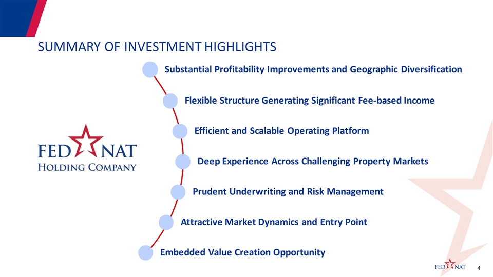 OFFERING SUMMARY Issuer FedNat Holding Company Exchange / Ticker Nasdaq / “FNHC” Offering Size 6,500,000 Common Shares (100% Primary) Over-allotment Option 15% General corporate purposes, including to provide additional liquidity in the holding company to be available for future Use of Proceeds capital contributions to insurance company subsidiaries, if necessary Lock-Up 90 days for executive officers and directors Sole Bookrunner Piper Sandler & Co. th Expected Timing Week of March 8 3OFFERING SUMMARY Issuer FedNat Holding Company Exchange / Ticker Nasdaq / “FNHC” Offering Size 6,500,000 Common Shares (100% Primary) Over-allotment Option 15% General corporate purposes, including to provide additional liquidity in the holding company to be available for future Use of Proceeds capital contributions to insurance company subsidiaries, if necessary Lock-Up 90 days for executive officers and directors Sole Bookrunner Piper Sandler & Co. th Expected Timing Week of March 8 3