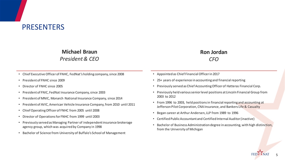 PRESENTERS Michael Braun Ron Jordan President & CEO CFO • Chief Executive Officer of FNHC, FedNat’s holding company, since 2008 • Appointed as Chief Financial Officer in 2017 • 25+ years of experience in accounting and financial reporting • President of FNHC since 2009 • Previously served as Chief Accounting Officer of Hatteras Financial Corp. • Director of FNHC since 2005 • Previously held various senior level positions at Lincoln Financial Group from • President of FNIC, FedNat Insurance Company, since 2003 2003 to 2012 • President of MNIC, Monarch National Insurance Company, since 2014 • From 1996 to 2003, held positions in financial reporting and accounting at • President of AVIC, American Vehicle Insurance Company, from 2010 until 2011 Jefferson Pilot Corporation, CNA Insurance, and Bankers Life & Casualty • Chief Operating Officer of FNHC from 2005 until 2008 • Began career at Arthur Andersen, LLP from 1989 to 1996 • Director of Operations for FNHC from 1999 until 2003 • Certified Public Accountant and Certified Internal Auditor (inactive) • Previously served as Managing Partner of independent insurance brokerage • Bachelor of Business Administration degree in accounting, with high distinction, agency group, which was acquired by Company in 1998 from the University of Michigan • Bachelor of Science from University of Buffalo’s School of Management 5PRESENTERS Michael Braun Ron Jordan President & CEO CFO • Chief Executive Officer of FNHC, FedNat’s holding company, since 2008 • Appointed as Chief Financial Officer in 2017 • 25+ years of experience in accounting and financial reporting • President of FNHC since 2009 • Previously served as Chief Accounting Officer of Hatteras Financial Corp. • Director of FNHC since 2005 • Previously held various senior level positions at Lincoln Financial Group from • President of FNIC, FedNat Insurance Company, since 2003 2003 to 2012 • President of MNIC, Monarch National Insurance Company, since 2014 • From 1996 to 2003, held positions in financial reporting and accounting at • President of AVIC, American Vehicle Insurance Company, from 2010 until 2011 Jefferson Pilot Corporation, CNA Insurance, and Bankers Life & Casualty • Chief Operating Officer of FNHC from 2005 until 2008 • Began career at Arthur Andersen, LLP from 1989 to 1996 • Director of Operations for FNHC from 1999 until 2003 • Certified Public Accountant and Certified Internal Auditor (inactive) • Previously served as Managing Partner of independent insurance brokerage • Bachelor of Business Administration degree in accounting, with high distinction, agency group, which was acquired by Company in 1998 from the University of Michigan • Bachelor of Science from University of Buffalo’s School of Management 5