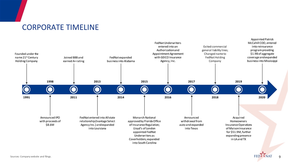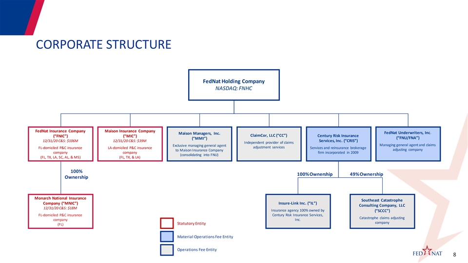 CORPORATE STRUCTURE FedNat Holding Company NASDAQ: FNHC FedNat Insurance Company Maison Insurance Company FedNat Underwriters, Inc. Maison Managers, Inc. ClaimCor, LLC (“CC”) Century Risk Insurance (“FNIC”) (“MIC”) (“FNU/FNA”) (“MMI”) 12/31/20 C&S: $106M 12/31/20 C&S: $39M Services, Inc. (“CRIS”) Independent provider of claims Managing general agent and claims Exclusive managing general agent adjustment services FL-domiciled P&C insurance LA-domiciled P&C insurance Services and reinsurance brokerage adjusting company to Maison Insurance Company company company firm incorporated in 2009 (consolidating into FNU) (FL, TX, LA, SC, AL, & MS) (FL, TX, & LA) 100% 100% Ownership 49% Ownership Ownership Monarch National Insurance Southeast Catastrophe Company (“MNIC”) Insure-Link Inc. (“IL”) Consulting Company, LLC 12/31/20 C&S: $18M Insurance agency 100% owned by (“SCCC”) FL-domiciled P&C insurance Century Risk Insurance Services, Catastrophe claims adjusting company Inc. company Statutory Entity (FL) Material Operations Fee Entity Operations Fee Entity 8CORPORATE STRUCTURE FedNat Holding Company NASDAQ: FNHC FedNat Insurance Company Maison Insurance Company FedNat Underwriters, Inc. Maison Managers, Inc. ClaimCor, LLC (“CC”) Century Risk Insurance (“FNIC”) (“MIC”) (“FNU/FNA”) (“MMI”) 12/31/20 C&S: $106M 12/31/20 C&S: $39M Services, Inc. (“CRIS”) Independent provider of claims Managing general agent and claims Exclusive managing general agent adjustment services FL-domiciled P&C insurance LA-domiciled P&C insurance Services and reinsurance brokerage adjusting company to Maison Insurance Company company company firm incorporated in 2009 (consolidating into FNU) (FL, TX, LA, SC, AL, & MS) (FL, TX, & LA) 100% 100% Ownership 49% Ownership Ownership Monarch National Insurance Southeast Catastrophe Company (“MNIC”) Insure-Link Inc. (“IL”) Consulting Company, LLC 12/31/20 C&S: $18M Insurance agency 100% owned by (“SCCC”) FL-domiciled P&C insurance Century Risk Insurance Services, Catastrophe claims adjusting company Inc. company Statutory Entity (FL) Material Operations Fee Entity Operations Fee Entity 8