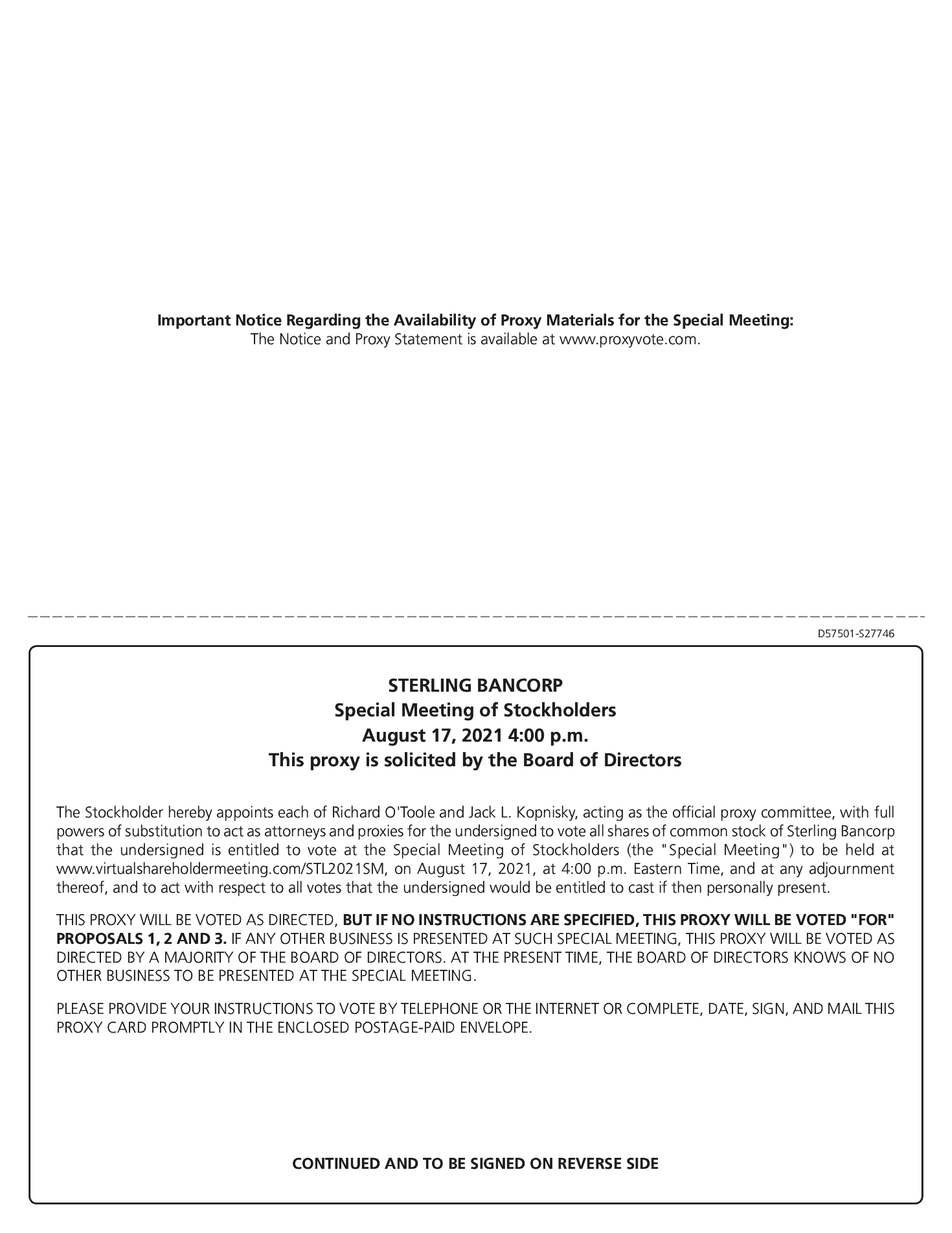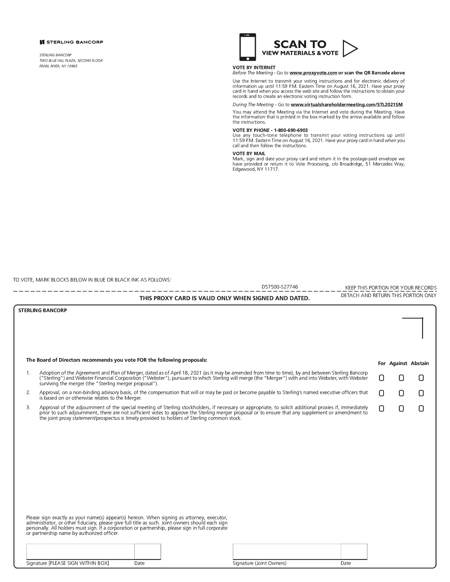 Holders of Sterling series A preferred stock and holders of depositary shares representing Sterling series A preferred stock are not entitled to, and are not requested to, vote at the Sterling special meeting. Holders of Webster preferred stock and holders of depositary shares representing Webster preferred stock are not entitled to, and are not requested to, vote at the Webster special meeting. Whether or not you plan to attend your company’s respective virtual special meeting, please vote as soon as possible to make sure that your shares are represented at the meeting. If your shares are held in the name of a broker, bank, trustee or other nominee, please follow the instructions provided to you by such record holder. If you do not vote, it will have the same effect as voting “AGAINST” the merger.