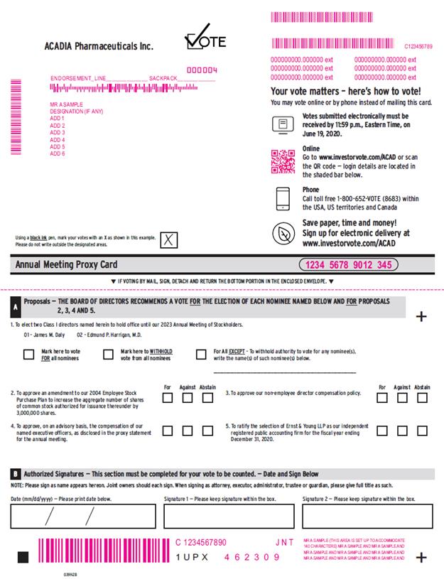 ACADIA Pharmaceuticals Inc. Using a black ink pen, mark your votes with an X as shown in this example. Please do not write outside the designated areas. 039H2B + + Proposals — THE BOARD OF DIRECTORS RECOMMENDS A VOTE FOR THE ELECTION OF EACH NOMINEE NAMED BELOW AND FOR PROPOSALS A 2, 3, 4 AND 5. 2. To approve an amendment to our 2004 Employee Stock Purchase Plan to increase the aggregate number of shares of common stock authorized for issuance thereunder by 3,000,000 shares. 3. To approve our non-employee director compensation policy. 1. To elect two Class I directors named herein to hold office until our 2023 Annual Meeting of Stockholders. For Against Abstain NOTE: Please sign as name appears hereon. Joint owners should each sign. When signing as attorney, executor, administrator, trustee or guardian, please give full title as such. Date (mm/dd/yyyy) — Please print date below. Signature 1 — Please keep signature within the box. Signature 2 — Please keep signature within the box. B Authorized Signatures — This section must be completed for your vote to be counted. — Date and Sign Below 4. To approve, on an advisory basis, the compensation of our named executive officers, as disclosed in the proxy statement for the annual meeting. 5. To ratify the selection of Ernst & Young LLP as our independent registered public accounting firm for the fiscal year ending December 31, 2020. q IF VOTING BY MAIL, SIGN, DETACH AND RETURN THE BOTTOM PORTION IN THE ENCLOSED ENVELOPE.q Annual Meeting Proxy Card For Against Abstain 000004 MR A SAMPLE DESIGNATION (IF ANY) ADD 1 ADD 2 ADD 3 ADD 4 ADD 5 ADD 6 ENDORSEMENT_LINE______________ SACKPACK_____________ 1234 5678 9012 345 MMMMMMMMM MMMMMMMMMMMMMMM 4 6 2 3 0 9 MR A SAMPLE (THIS AREA IS SET UP TO ACCOMMODATE 140 CHARACTERS) MR A SAMPLE AND MR A SAMPLE AND MR A SAMPLE AND MR A SAMPLE AND MR A SAMPLE AND MR A SAMPLE AND MR A SAMPLE AND MR A SAMPLE AND C 1234567890 J N T C123456789 MMMMMMMMMMMM M MMMMMMM 000000000.000000 ext 000000000.000000 ext 000000000.000000 ext 000000000.000000 ext 000000000.000000 ext 000000000.000000 ext If no electronic voting, delete QR code and control # Δ ≈ You may vote online or by phone instead of mailing this card. Online Go to www.investorvote.com/ACAD or scan the QR code — login details are located in the shaded bar below. Save paper, time and money! Sign up for electronic delivery at www.investorvote.com/ACAD Phone Call toll free 1-800-652-VOTE (8683) within the USA, US territories and Canada Votes submitted electronically must be received by 11:59 p.m., Eastern Time, on June 19, 2020. Your vote matters – here’s how to vote! 1. To elect two Class I directors named herein to hold office until our 2023 Annual Meeting of Stockholders. 01 - James M. Daly 02 - Edmund P. Harrigan, M.D. Mark here to WITHHOLD vote from all nominees For All EXCEPT - To withhold authority to vote for any nominee(s), write the name(s) of such nominee(s) below. Mark here to vote FOR all nominees 1 U P X