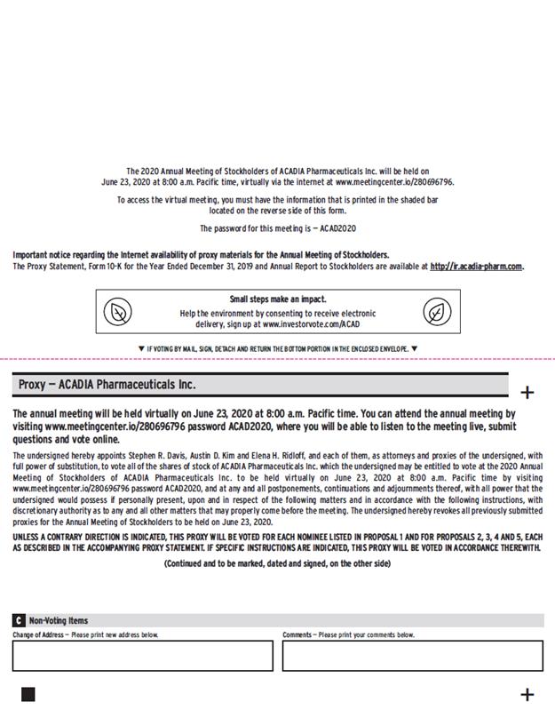 The 2020 Annual Meeting of Stockholders of ACADIA Pharmaceuticals Inc. will be held on June 23, 2020 at 8:00 a.m. Pacific time, virtually via the internet at www.meetingcenter.io/280696796. To access the virtual meeting, you must have the information that is printed in the shaded bar located on the reverse side of this form. The password for this meeting is — ACAD2020 Important notice regarding the Internet availability of proxy materials for the Annual Meeting of Stockholders. The Proxy Statement, Form 10-K for the Year Ended December 31, 2019 and Annual Report to Stockholders are available at http://ir.acadia-pharm.com. Small steps make an impact. Help the environment by consenting to receive electronic delivery, sign up at www.investorvote.com/ACAD IF VOTING BY MAIL, SIGN, DETACH AND RETURN THE BOTTOM PORTION IN THE ENCLOSED ENVELOPE. Proxy — ACADIA Pharmaceuticals Inc. The annual meeting will be held virtually on June 23, 2020 at 8:00 a.m. Pacific time. You can attend the annual meeting by visiting www.meetingcenter.io/280696796 password ACAD2020, where you will be able to listen to the meeting live, submit questions and vote online. The undersigned hereby appoints Stephen R. Davis, Austin D. Kim and Elena H. Ridloff, and each of them, as attorneys and proxies of the undersigned, with full power of substitution, to vote all of the shares of stock of ACADIA Pharmaceuticals Inc. which the undersigned may be entitled to vote at the 2020 Annual Meeting of Stockholders of ACADIA Pharmaceuticals Inc. to be held virtually on June 23, 2020 at 8:00 a.m. Pacific time by visiting www.meetingcenter.io/280696796 password ACAD2020, and at any and all postponements, continuations and adjournments thereof, with all power that the undersigned would possess if personally present, upon and in respect of the following matters and in accordance with the following instructions, with discretionary authority as to any and all other matters that may properly come before the meeting. The undersigned hereby revokes all previously submitted proxies for the Annual Meeting of Stockholders to be held on June 23, 2020. UNLESS A CONTRARY DIRECTION IS INDICATED, THIS PROXY WILL BE VOTED FOR EACH NOMINEE LISTED IN PROPOSAL 1 AND FOR PROPOSALS 2, 3, 4 AND 5, EACH AS DESCRIBED IN THE ACCOMPANYING PROXY STATEMENT. IF SPECIFIC INSTRUCTIONS ARE INDICATED, THIS PROXY WILL BE VOTED IN ACCORDANCE THEREWITH. (Continued and to be marked, dated and signed, on the other side) C Non-Voting Items Change of Address — Please print new address below. Comments — Please print your comments below.