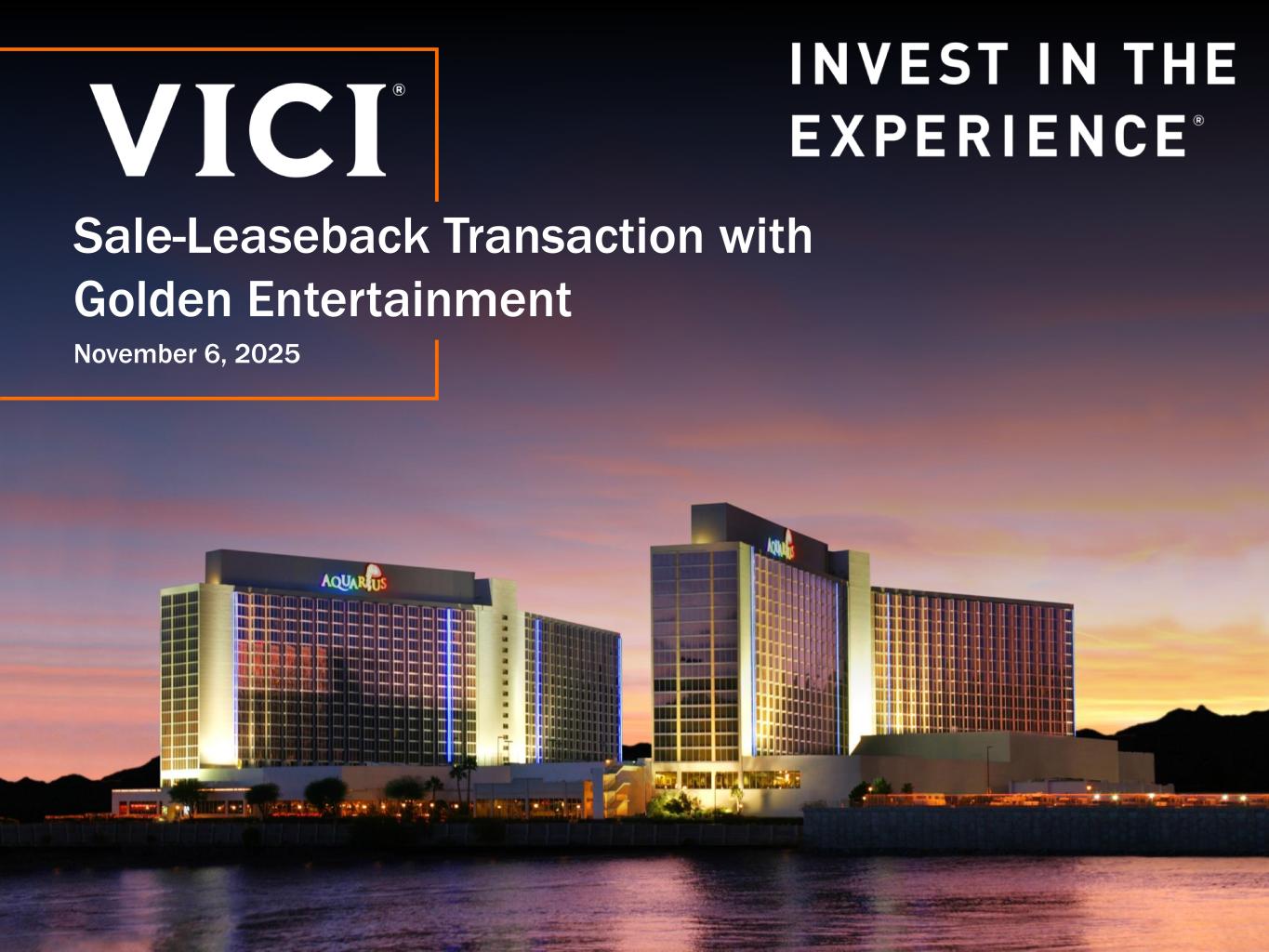 NEW YORK, NY – November 6, 2025 – VICI Properties Inc. (NYSE: VICI) (“VICI Properties”, “VICI” or the “Company”) announced today that it has entered into an agreement to acquire 100% of the land, real property and improvements of seven casino properties (the “Golden Portfolio”) from Golden Entertainment, Inc. (NASDAQ: GDEN) (“Golden”) for $1.16 billion and to enter into a triple-net master lease (the “Golden Master Lease”) with a newly formed entity that will be owned and controlled by Blake L. Sartini, current chairman and chief executive officer of Golden, which entity will acquire the operating business of Golden in connection with the closing of the transaction (“Golden OpCo”).