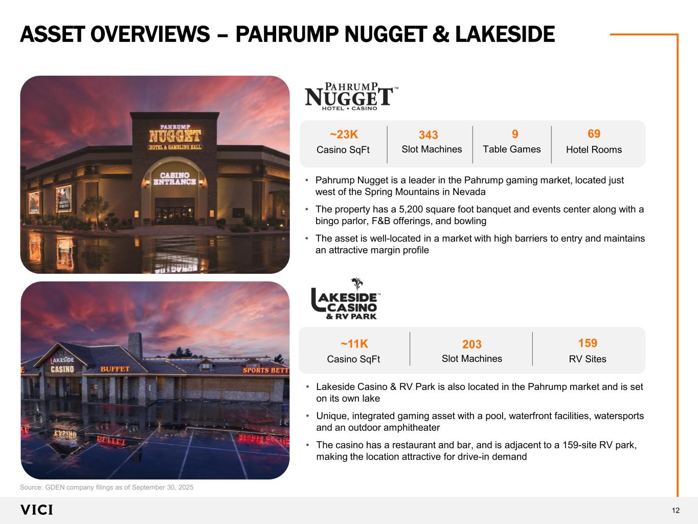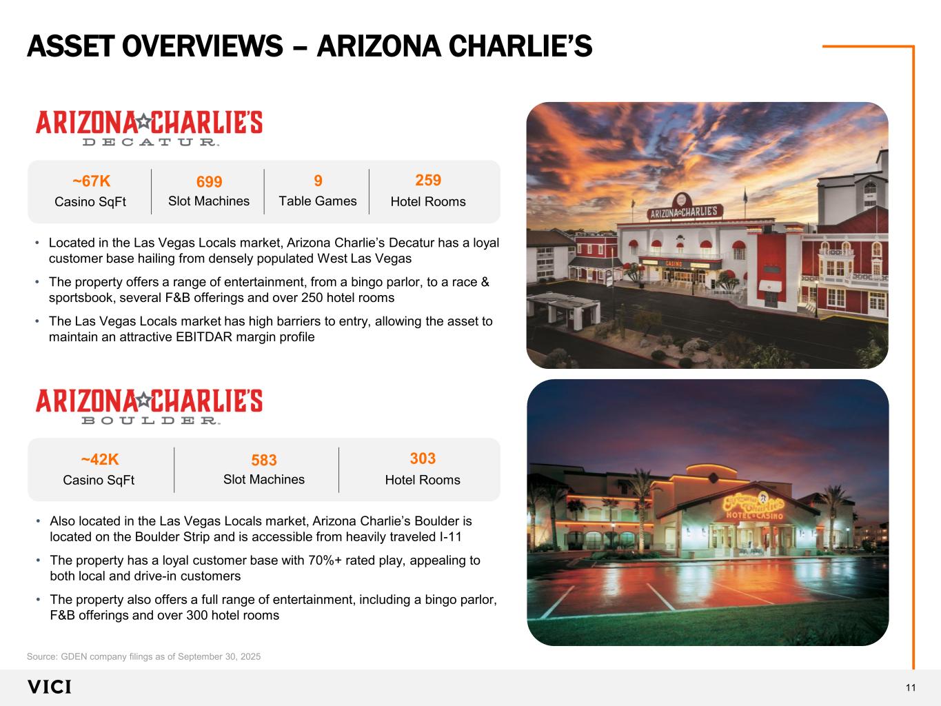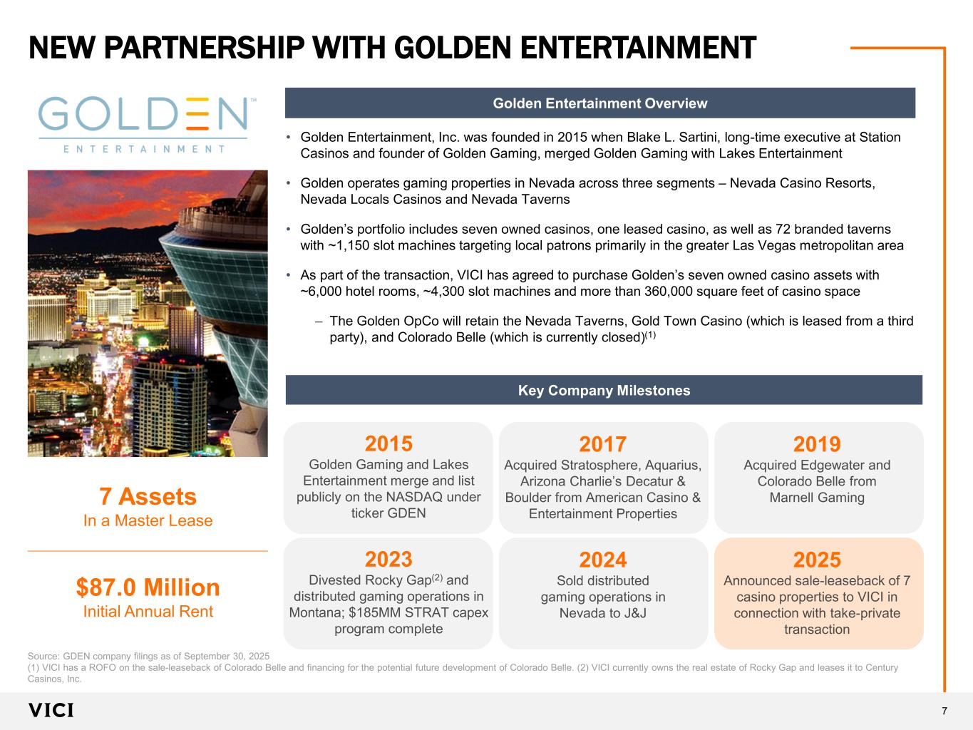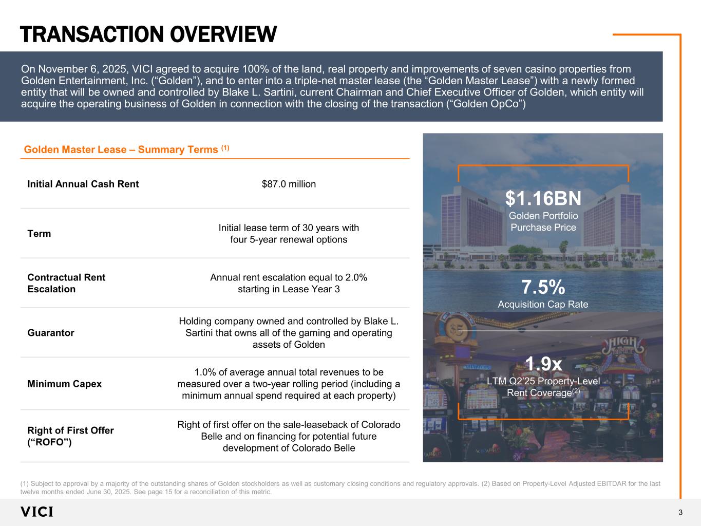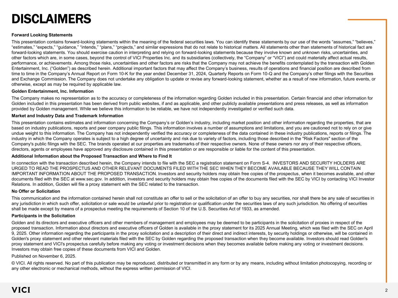 2 DISCLAIMERS Forward Looking Statements This presentation contains forward-looking statements within the meaning of the federal securities laws. You can identify these statements by our use of the words “assumes,” “believes,” “estimates,” “expects,” “guidance,” “intends,” “plans,” “projects,” and similar expressions that do not relate to historical matters. All statements other than statements of historical fact are forward-looking statements. You should exercise caution in interpreting and relying on forward-looking statements because they involve known and unknown risks, uncertainties, and other factors which are, in some cases, beyond the control of VICI Properties Inc. and its subsidiaries (collectively, the “Company” or “VICI”) and could materially affect actual results, performance, or achievements. Among those risks, uncertainties and other factors are risks that the Company may not achieve the benefits contemplated by the transaction with Golden Entertainment, Inc. (“Golden”) as described herein. Additional important factors that may affect the Company’s business, results of operations and financial position are described from time to time in the Company’s Annual Report on Form 10-K for the year ended December 31, 2024, Quarterly Reports on Form 10-Q and the Company’s other filings with the Securities and Exchange Commission. The Company does not undertake any obligation to update or revise any forward-looking statement, whether as a result of new information, future events, or otherwise, except as may be required by applicable law. Golden Entertainment, Inc. Information The Company makes no representation as to the accuracy or completeness of the information regarding Golden included in this presentation. Certain financial and other information for Golden included in this presentation has been derived from public websites, if and as applicable, and other publicly available presentations and press releases, as well as information provided by Golden management. While we believe this information to be reliable, we have not independently investigated or verified such data. Market and Industry Data and Trademark Information This presentation contains estimates and information concerning the Company’s or Golden’s industry, including market position and other information regarding the properties, that are based on industry publications, reports and peer company public filings. This information involves a number of assumptions and limitations, and you are cautioned not to rely on or give undue weight to this information. The Company has not independently verified the accuracy or completeness of the data contained in these industry publications, reports or filings. The industry in which the Company operates is subject to a high degree of uncertainty and risk due to variety of factors, including those described in the "Risk Factors" section of the Company's public filings with the SEC. The brands operated at our properties are trademarks of their respective owners. None of these owners nor any of their respective officers, directors, agents or employees have approved any disclosure contained in this presentation or are responsible or liable for the content of this presentation. Additional Information about the Proposed Transaction and Where to Find It In connection with the transaction described herein, the Company intends to file with the SEC a registration statement on Form S-4. INVESTORS AND SECURITY HOLDERS ARE URGED TO READ THE PROSPECTUS AND OTHER RELEVANT DOCUMENTS FILED WITH THE SEC WHEN THEY BECOME AVAILABLE BECAUSE THEY WILL CONTAIN IMPORTANT INFORMATION ABOUT THE PROPOSED TRANSACTION. Investors and security holders may obtain free copies of the prospectus, when it becomes available, and other documents filed with the SEC at www.sec.gov. In addition, investors and security holders may obtain free copies of the documents filed with the SEC by VICI by contacting VICI Investor Relations. In addition, Golden will file a proxy statement with the SEC related to the transaction. No Offer or Solicitation This communication and the information contained herein shall not constitute an offer to sell or the solicitation of an offer to buy any securities, nor shall there be any sale of securities in any jurisdiction in which such offer, solicitation or sale would be unlawful prior to registration or qualification under the securities laws of any such jurisdiction. No offering of securities shall be made except by means of a prospectus meeting the requirements of Section 10 of the U.S. Securities Act of 1933, as amended. Participants in the Solicitation Golden and its directors and executive officers and other members of management and employees may be deemed to be participants in the solicitation of proxies in respect of the proposed transaction. Information about directors and executive officers of Golden is available in the proxy statement for its 2025 Annual Meeting, which was filed with the SEC on April 9, 2025. Other information regarding the participants in the proxy solicitation and a description of their direct and indirect interests, by security holdings or otherwise, will be contained in Golden's proxy statement and other relevant materials filed with the SEC by Golden regarding the proposed transaction when they become available. Investors should read Golden's proxy statement and VICI's prospectus carefully before making any voting or investment decisions when they becomes available before making any voting or investment decisions. Investors may obtain free copies of these documents from VICI and Golden. Published on November 6, 2025. © VICI. All rights reserved. No part of this publication may be reproduced, distributed or transmitted in any form or by any means, including without limitation photocopying, recording or any other electronic or mechanical methods, without the express written permission of VICI.