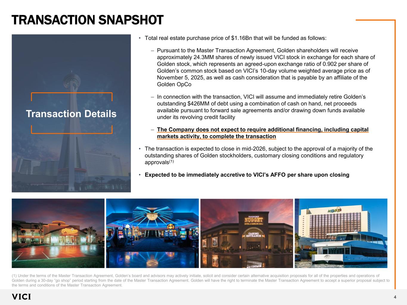 3 TRANSACTION OVERVIEW On November 6, 2025, VICI agreed to acquire 100% of the land, real property and improvements of seven casino properties from Golden Entertainment, Inc. (“Golden”), and to enter into a triple-net master lease (the “Golden Master Lease”) with a newly formed entity that will be owned and controlled by Blake L. Sartini, current Chairman and Chief Executive Officer of Golden, which entity will acquire the operating business of Golden in connection with the closing of the transaction (“Golden OpCo”) (1) Subject to approval by a majority of the outstanding shares of Golden stockholders as well as customary closing conditions and regulatory approvals. (2) Based on Property-Level Adjusted EBITDAR for the last twelve months ended June 30, 2025. See page 15 for a reconciliation of this metric. Golden Master Lease – Summary Terms (1) Initial Annual Cash Rent $87.0 million Term Initial lease term of 30 years with four 5-year renewal options Contractual Rent Escalation Annual rent escalation equal to 2.0% starting in Lease Year 3 Guarantor Holding company owned and controlled by Blake L. Sartini that owns all of the gaming and operating assets of Golden Minimum Capex 1.0% of average annual total revenues to be measured over a two-year rolling period (including a minimum annual spend required at each property) Right of First Offer (“ROFO”) Right of first offer on the sale-leaseback of Colorado Belle and on financing for potential future development of Colorado Belle $1.16BN Golden Portfolio Purchase Price 7.5% Acquisition Cap Rate 1.9x LTM Q2’25 Property-Level Rent Coverage(2)
