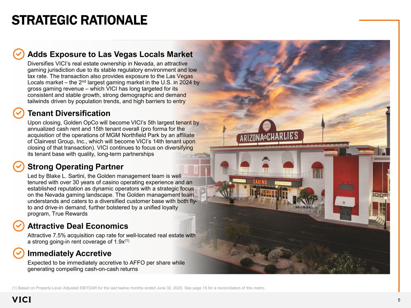 4 TRANSACTION SNAPSHOT Transaction Details • Total real estate purchase price of $1.16Bn that will be funded as follows: – Pursuant to the Master Transaction Agreement, Golden shareholders will receive approximately 24.3MM shares of newly issued VICI stock in exchange for each share of Golden stock, which represents an agreed-upon exchange ratio of 0.902 per share of Golden’s common stock based on VICI’s 10-day volume weighted average price as of November 5, 2025, as well as cash consideration that is payable by an affiliate of the Golden OpCo – In connection with the transaction, VICI will assume and immediately retire Golden’s outstanding $426MM of debt using a combination of cash on hand, net proceeds available pursuant to forward sale agreements and/or drawing down funds available under its revolving credit facility – The Company does not expect to require additional financing, including capital markets activity, to complete the transaction • The transaction is expected to close in mid-2026, subject to the approval of a majority of the outstanding shares of Golden stockholders, customary closing conditions and regulatory approvals(1) • Expected to be immediately accretive to VICI’s AFFO per share upon closing (1) Under the terms of the Master Transaction Agreement, Golden’s board and advisors may actively initiate, solicit and consider certain alternative acquisition proposals for all of the properties and operations of Golden during a 30-day “go shop” period starting from the date of the Master Transaction Agreement. Golden will have the right to terminate the Master Transaction Agreement to accept a superior proposal subject to the terms and conditions of the Master Transaction Agreement.