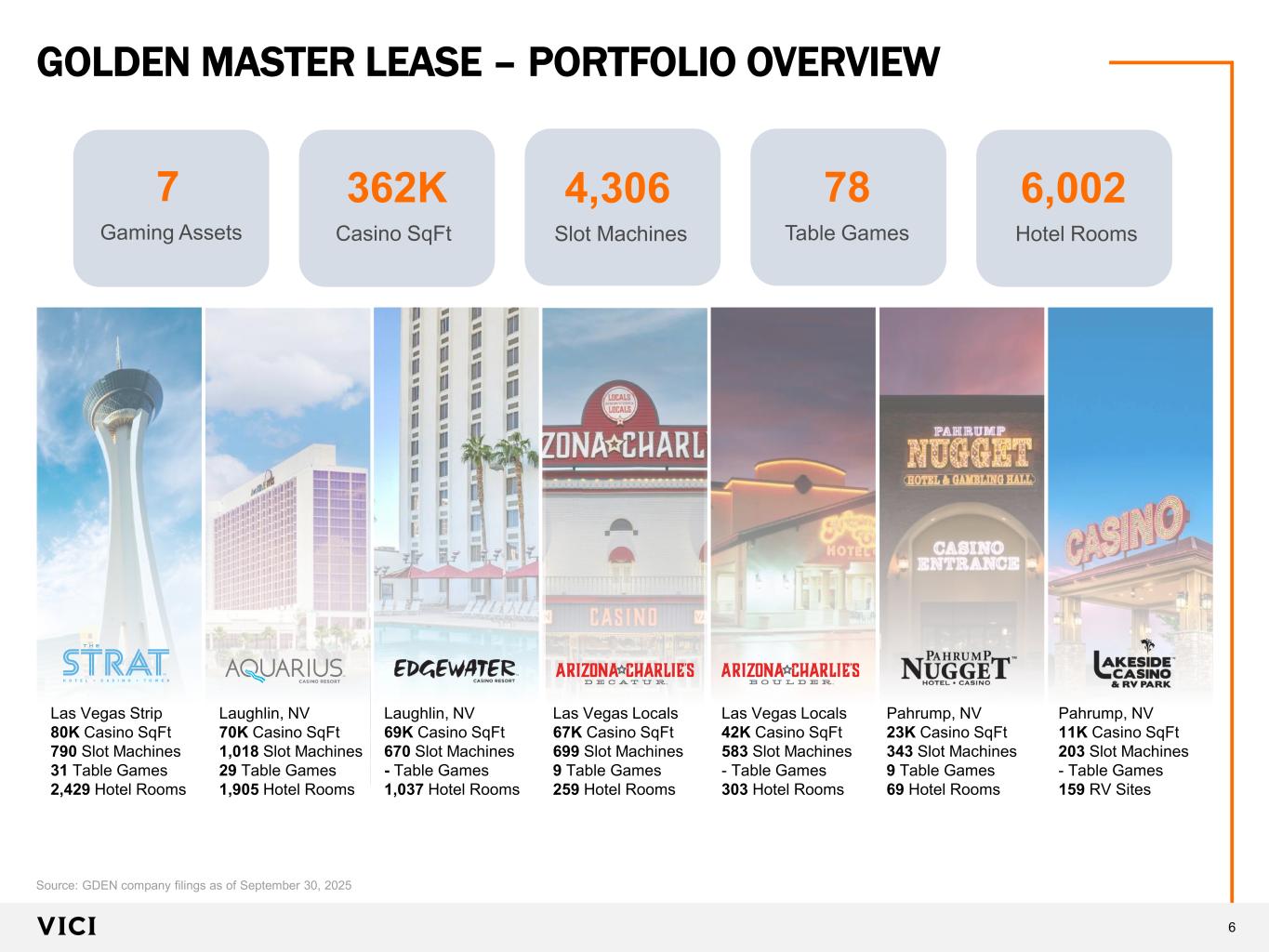 5 STRATEGIC RATIONALE Immediately Accretive Expected to be immediately accretive to AFFO per share while generating compelling cash-on-cash returns Strong Operating Partner Led by Blake L. Sartini, the Golden management team is well tenured with over 30 years of casino operating experience and an established reputation as dynamic operators with a strategic focus on the Nevada gaming landscape. The Golden management team understands and caters to a diversified customer base with both fly- to and drive-in demand, further bolstered by a unified loyalty program, True Rewards Adds Exposure to Las Vegas Locals Market Diversifies VICI’s real estate ownership in Nevada, an attractive gaming jurisdiction due to its stable regulatory environment and low tax rate. The transaction also provides exposure to the Las Vegas Locals market – the 2nd largest gaming market in the U.S. in 2024 by gross gaming revenue – which VICI has long targeted for its consistent and stable growth, strong demographic and demand tailwinds driven by population trends, and high barriers to entry Tenant Diversification Upon closing, Golden OpCo will become VICI’s 5th largest tenant by annualized cash rent and 15th tenant overall (pro forma for the acquisition of the operations of MGM Northfield Park by an affiliate of Clairvest Group, Inc., which will become VICI’s 14th tenant upon closing of that transaction). VICI continues to focus on diversifying its tenant base with quality, long-term partnerships Attractive Deal Economics Attractive 7.5% acquisition cap rate for well-located real estate with a strong going-in rent coverage of 1.9x(1) (1) Based on Property-Level Adjusted EBITDAR for the last twelve months ended June 30, 2025. See page 15 for a reconciliation of this metric.