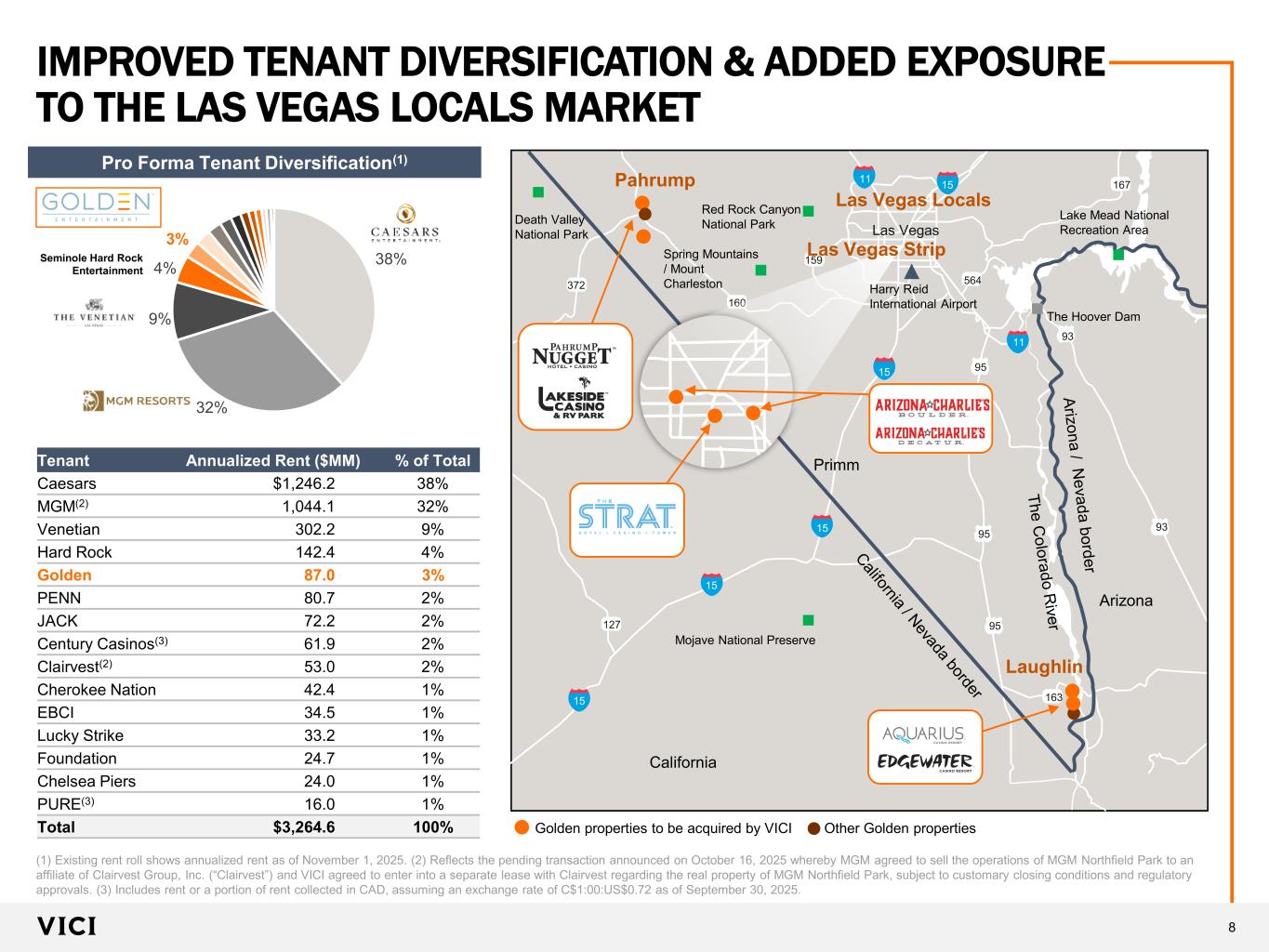 7 NEW PARTNERSHIP WITH GOLDEN ENTERTAINMENT Source: GDEN company filings as of September 30, 2025 (1) VICI has a ROFO on the sale-leaseback of Colorado Belle and financing for the potential future development of Colorado Belle. (2) VICI currently owns the real estate of Rocky Gap and leases it to Century Casinos, Inc. Golden Entertainment Overview • Golden Entertainment, Inc. was founded in 2015 when Blake L. Sartini, long-time executive at Station Casinos and founder of Golden Gaming, merged Golden Gaming with Lakes Entertainment • Golden operates gaming properties in Nevada across three segments – Nevada Casino Resorts, Nevada Locals Casinos and Nevada Taverns • Golden’s portfolio includes seven owned casinos, one leased casino, as well as 72 branded taverns with ~1,150 slot machines targeting local patrons primarily in the greater Las Vegas metropolitan area • As part of the transaction, VICI has agreed to purchase Golden’s seven owned casino assets with ~6,000 hotel rooms, ~4,300 slot machines and more than 360,000 square feet of casino space – The Golden OpCo will retain the Nevada Taverns, Gold Town Casino (which is leased from a third party), and Colorado Belle (which is currently closed)(1) 7 Assets In a Master Lease $87.0 Million Initial Annual Rent Key Company Milestones 2015 Golden Gaming and Lakes Entertainment merge and list publicly on the NASDAQ under ticker GDEN 2017 Acquired Stratosphere, Aquarius, Arizona Charlie’s Decatur & Boulder from American Casino & Entertainment Properties 2019 Acquired Edgewater and Colorado Belle from Marnell Gaming 2023 Divested Rocky Gap(2) and distributed gaming operations in Montana; $185MM STRAT capex program complete 2024 Sold distributed gaming operations in Nevada to J&J 2025 Announced sale-leaseback of 7 casino properties to VICI in connection with take-private transaction