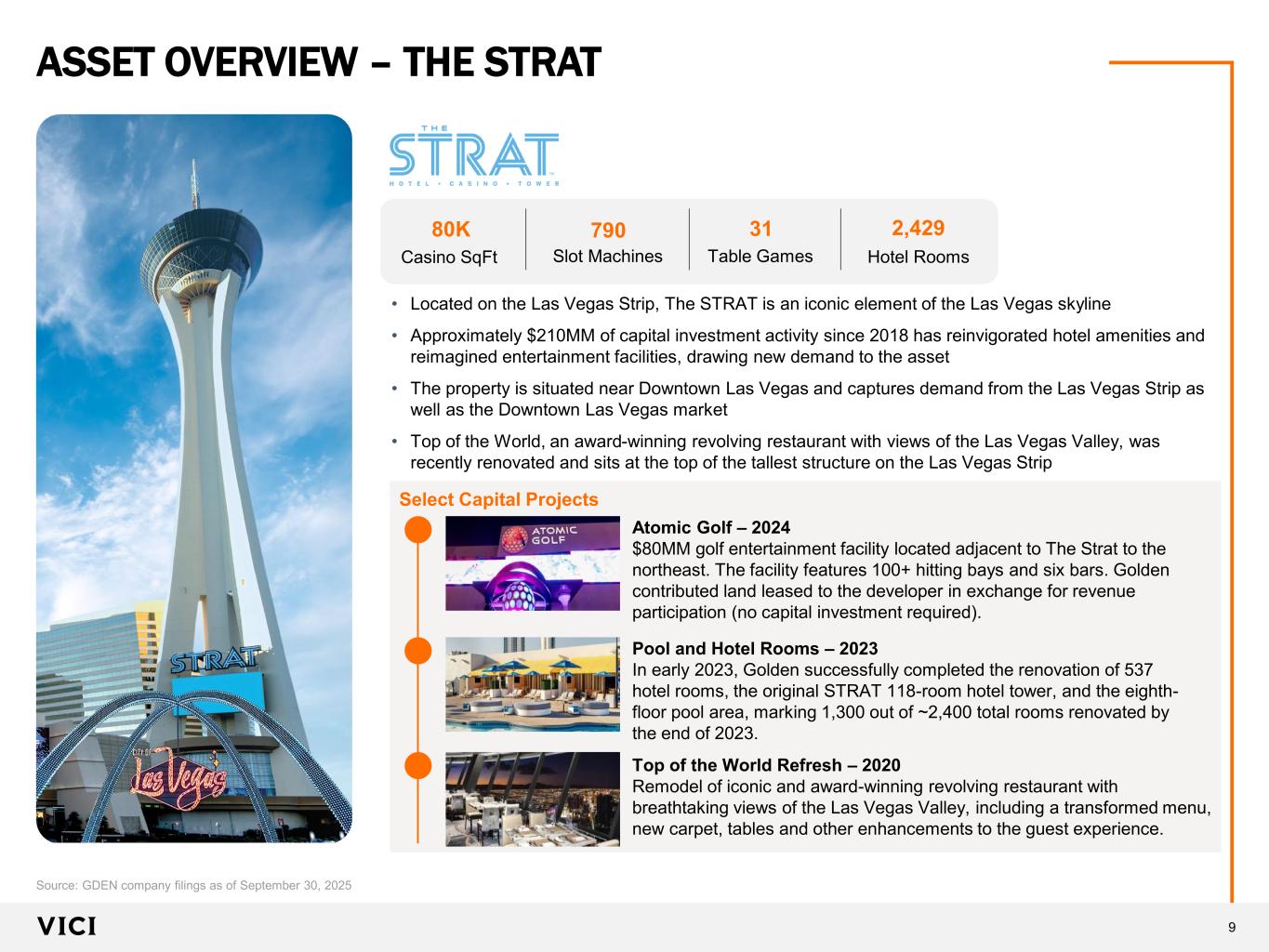 8 IMPROVED TENANT DIVERSIFICATION & ADDED EXPOSURE TO THE LAS VEGAS LOCALS MARKET Pahrump 163 95 15 127 15 15 95 9515 93 11 564 160 159 372 16715 11 Las Vegas 93 Laughlin Pahrump Las Vegas Strip Primm California Arizona Harry Reid International Airport The Hoover Dam Death Valley National Park Mojave National Preserve Lake Mead National Recreation Area Red Rock Canyon National Park Spring Mountains / Mount Charleston Pro Forma Tenant Diversification(1) Tenant Annualized Rent ($MM) % of Total Caesars $1,246.2 38% MGM(2) 1,044.1 32% Venetian 302.2 9% Hard Rock 142.4 4% Golden 87.0 3% PENN 80.7 2% JACK 72.2 2% Century Casinos(3) 61.9 2% Clairvest(2) 53.0 2% Cherokee Nation 42.4 1% EBCI 34.5 1% Lucky Strike 33.2 1% Foundation 24.7 1% Chelsea Piers 24.0 1% PURE(3) 16.0 1% Total $3,264.6 100% (1) Existing rent roll shows annualized rent as of November 1, 2025. (2) Reflects the pending transaction announced on October 16, 2025 whereby MGM agreed to sell the operations of MGM Northfield Park to an affiliate of Clairvest Group, Inc. (“Clairvest”) and VICI agreed to enter into a separate lease with Clairvest regarding the real property of MGM Northfield Park, subject to customary closing conditions and regulatory approvals. (3) Includes rent or a portion of rent collected in CAD, assuming an exchange rate of C$1:00:US$0.72 as of September 30, 2025. Seminole Hard Rock Entertainment Las Vegas Locals Golden properties to be acquired by VICI Other Golden properties 38% 32% 9% 4% 3%