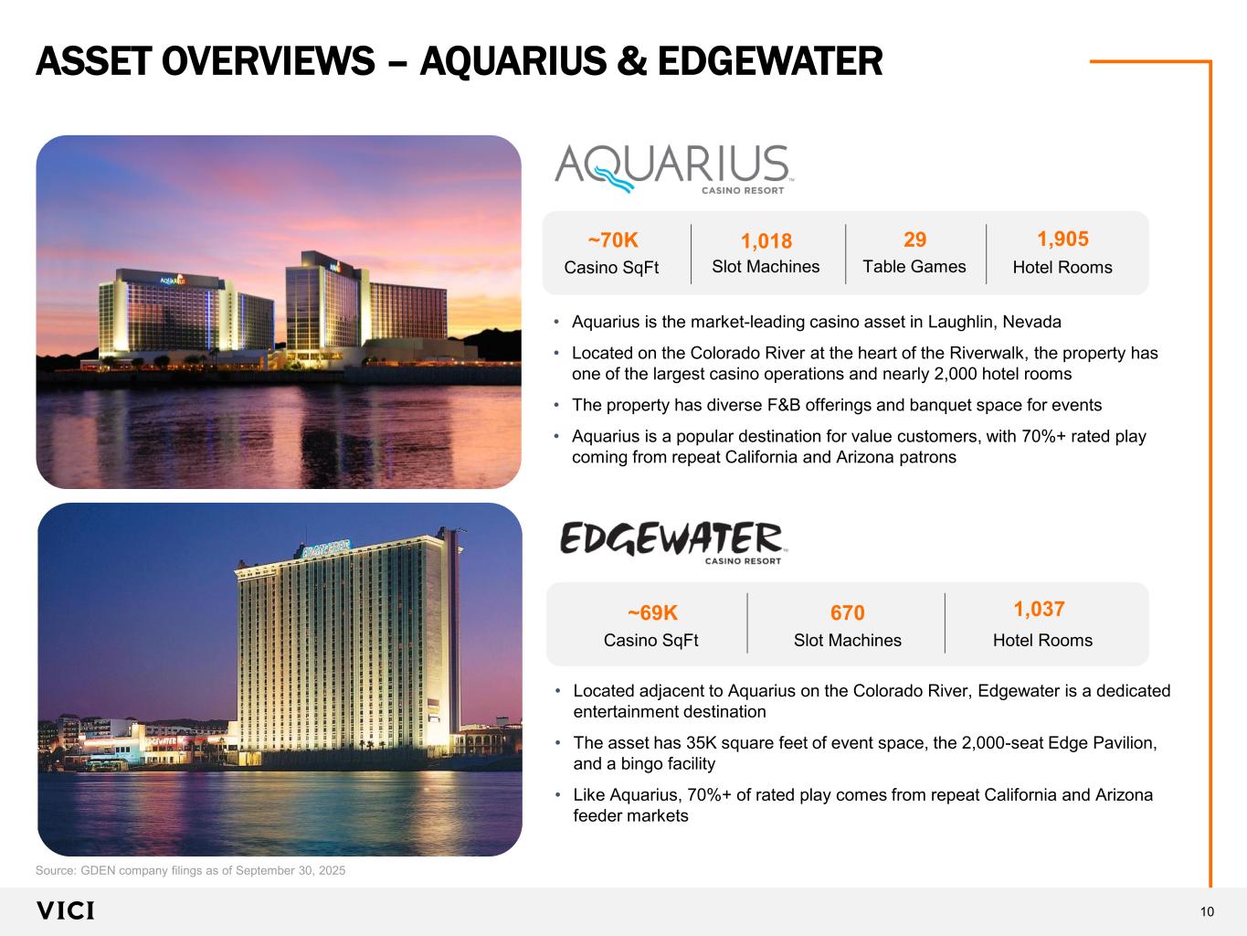 9 ASSET OVERVIEW – THE STRAT Source: GDEN company filings as of September 30, 2025 80K 790 31 2,429 Casino SqFt Slot Machines Table Games Hotel Rooms Select Capital Projects Atomic Golf – 2024 $80MM golf entertainment facility located adjacent to The Strat to the northeast. The facility features 100+ hitting bays and six bars. Golden contributed land leased to the developer in exchange for revenue participation (no capital investment required). Pool and Hotel Rooms – 2023 In early 2023, Golden successfully completed the renovation of 537 hotel rooms, the original STRAT 118-room hotel tower, and the eighth- floor pool area, marking 1,300 out of ~2,400 total rooms renovated by the end of 2023. Top of the World Refresh – 2020 Remodel of iconic and award-winning revolving restaurant with breathtaking views of the Las Vegas Valley, including a transformed menu, new carpet, tables and other enhancements to the guest experience. • Located on the Las Vegas Strip, The STRAT is an iconic element of the Las Vegas skyline • Approximately $210MM of capital investment activity since 2018 has reinvigorated hotel amenities and reimagined entertainment facilities, drawing new demand to the asset • The property is situated near Downtown Las Vegas and captures demand from the Las Vegas Strip as well as the Downtown Las Vegas market • Top of the World, an award-winning revolving restaurant with views of the Las Vegas Valley, was recently renovated and sits at the top of the tallest structure on the Las Vegas Strip